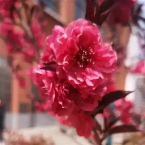 (2)重辨榆叶梅:开红褐色花,花朵大,重瓣,花朵多而密集,花萼10片以上,花萼和花梗均带有红晕。重瓣榆叶梅,枝条皮多开裂。因其花朵大,故又称“大花榆叶梅”,是一种观赏价值较高的品种.