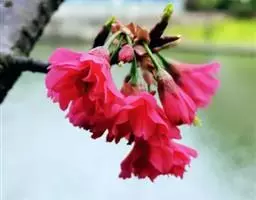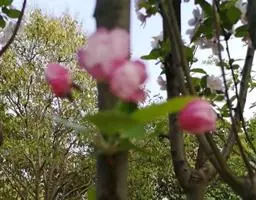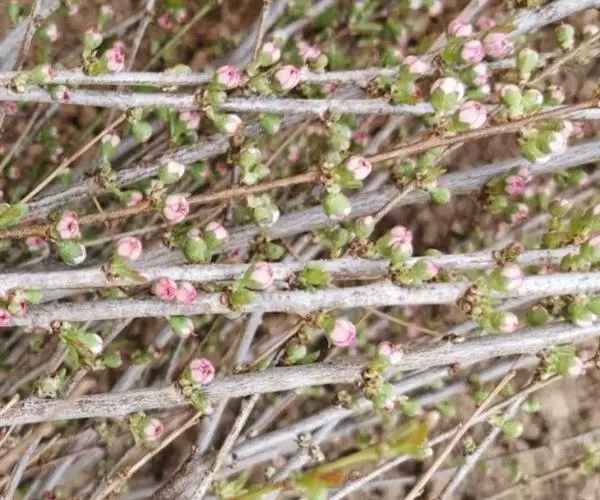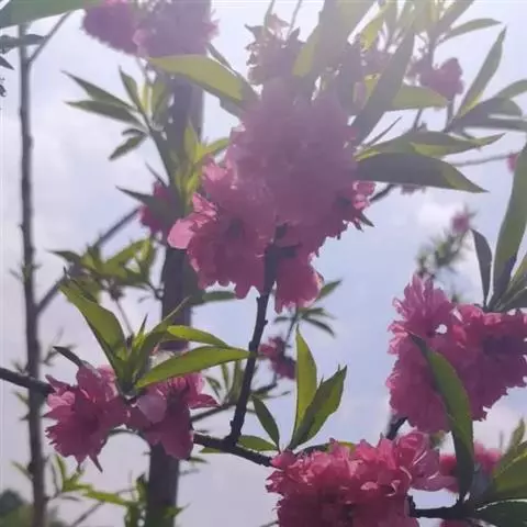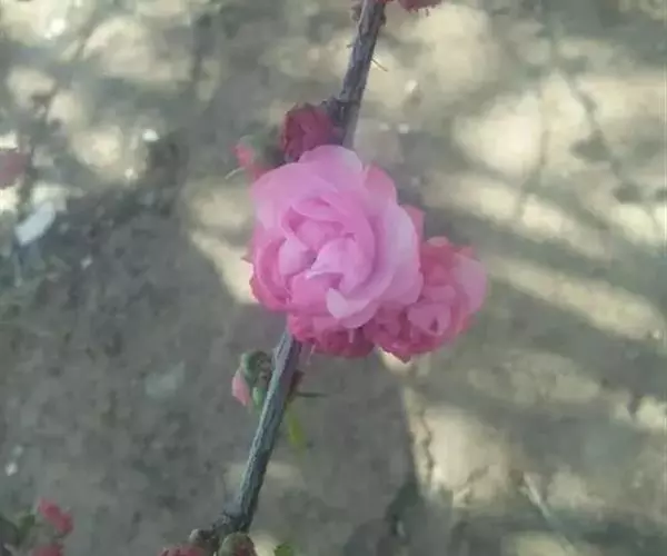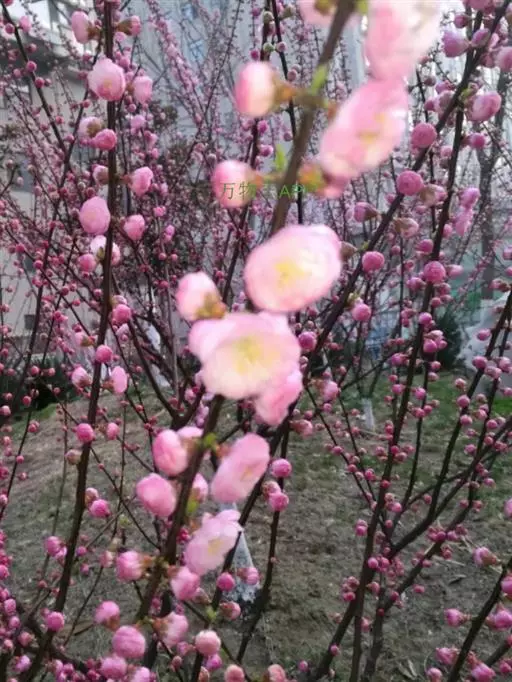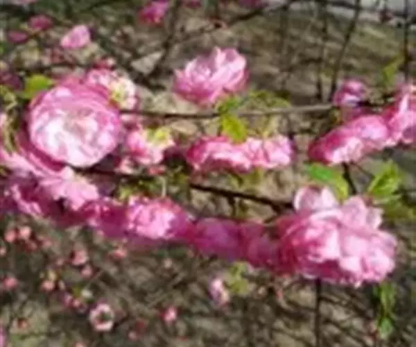 (3)半重瓣榆叶梅:粉红色花朵,半重瓣,花菩、花辨均在10片以上。植株的小枝呈红褐色,园林、庭院中栽培比较广泛。