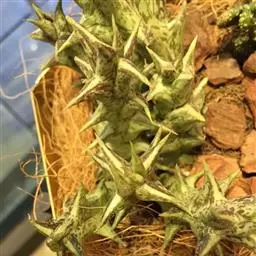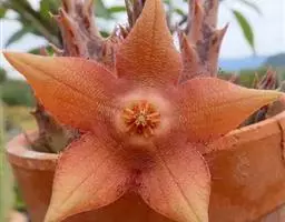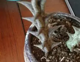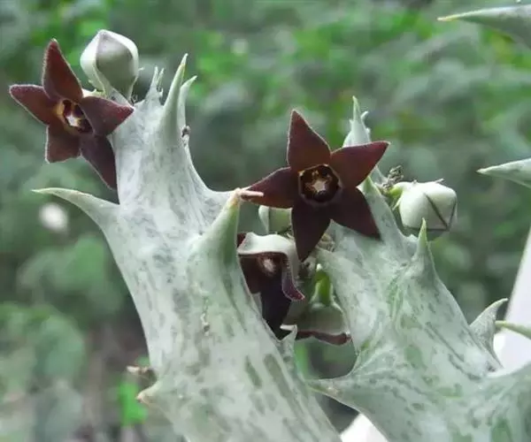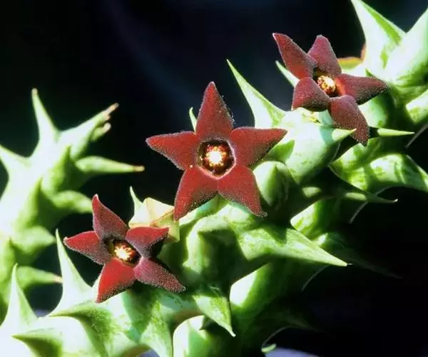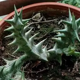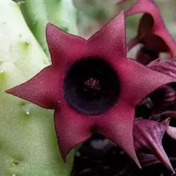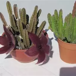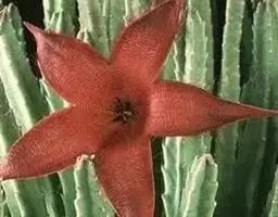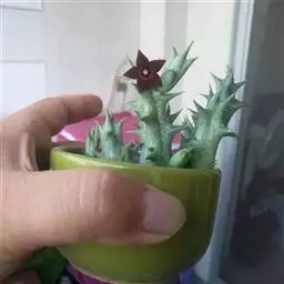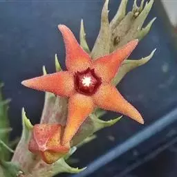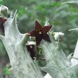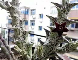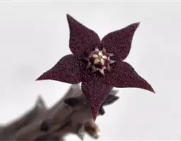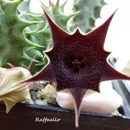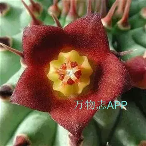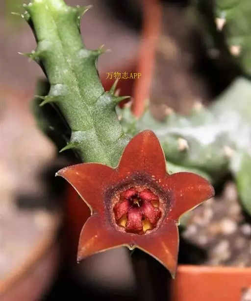 紫龙角(Caralluma hesperidum)萝藦科水牛掌属(水牛角属),分布于北非、地中海地区和南也门的索科特拉岛,又名水牛角。开出的花很招苍蝇。多年生肉质草本,植株灰绿色,表面长有紫褐色斑纹。看起来好像很硬,但摸起来却软软的。植株低矮,分枝多,开深褐红色星状的花,花有臭味,会吸引苍蝇,所以很少有人在养。