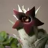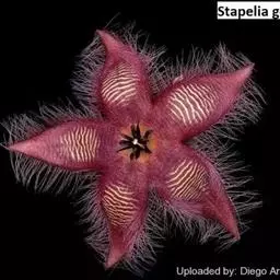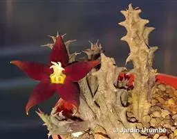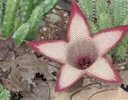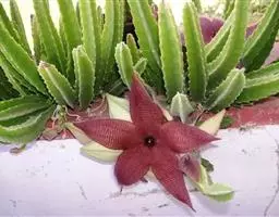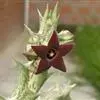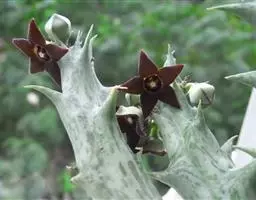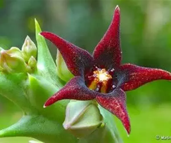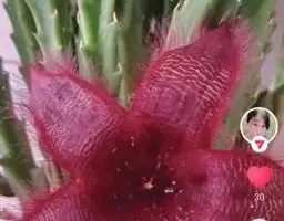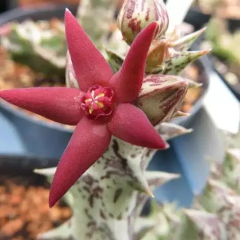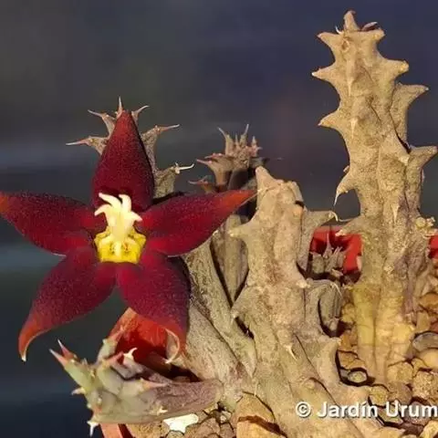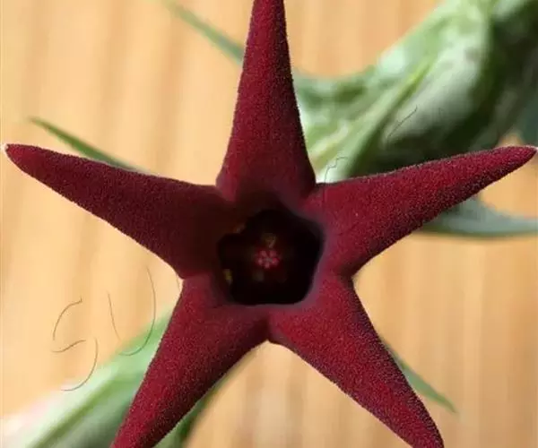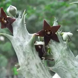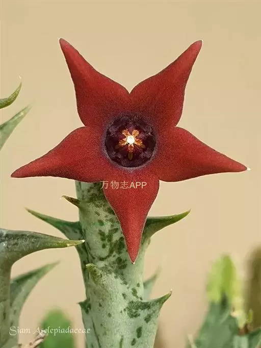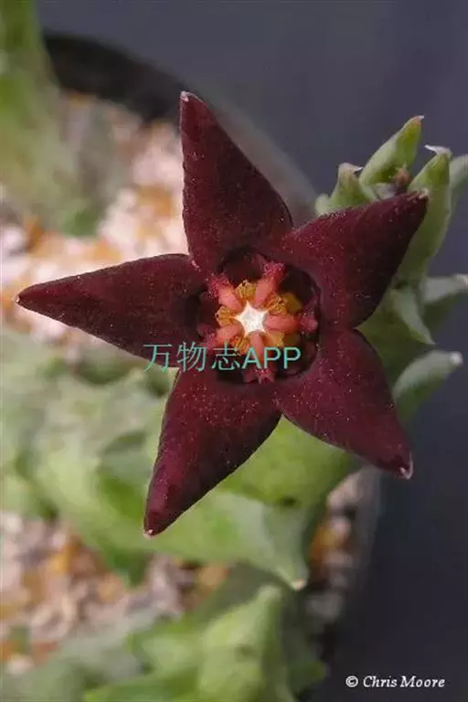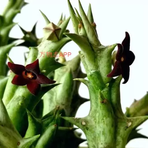紫龙角,多年生肉质草本,植株灰绿色,表面长有紫褐色斑纹,棱缘波 状,有齿状突起。看起来好像很硬,但摸起来却软软的。植株低矮,分枝多,开深褐红色星状的花,花星状,深褐红色,被白色浓毛,花有臭味,会吸引苍蝇。
