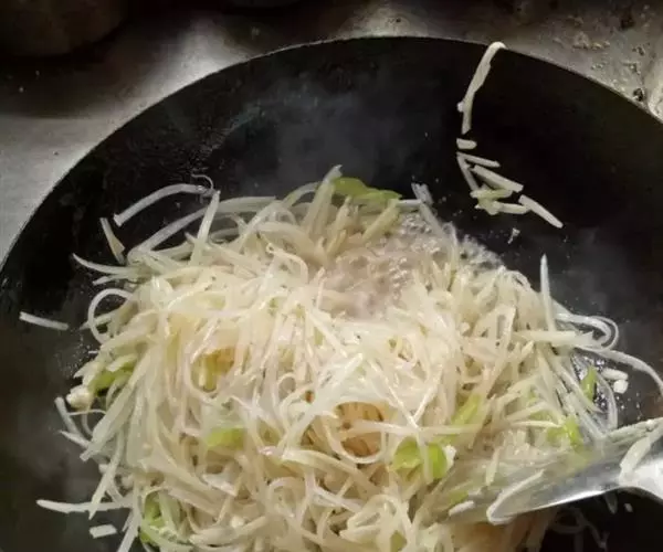 2.炒锅注油烧热,下葱,姜丝爆锅,下入三丝翻炒,加味精,精盐炒匀,淋香醋出锅即可。