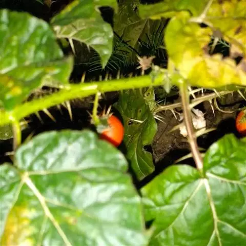 乳茄,茄科茄属直立草本植物,覆盖短的柔毛和扁平尖刺,小枝覆盖长柔毛和扁平刺,刺为蜡黄色,…