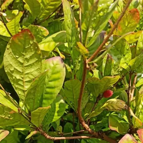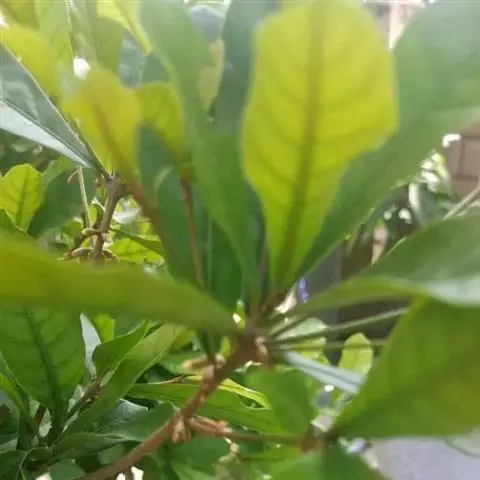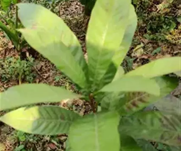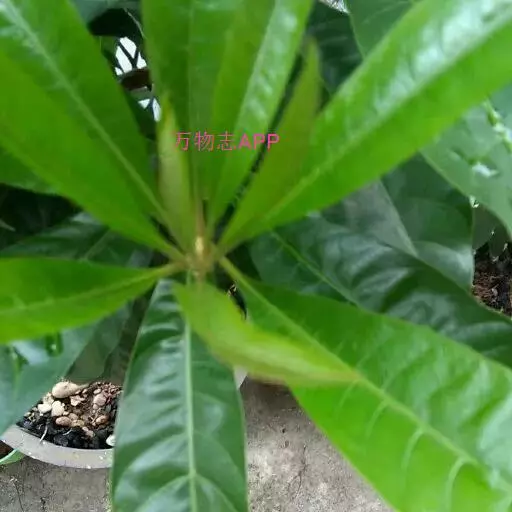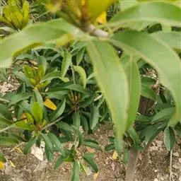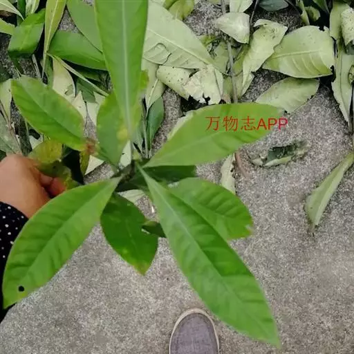蛋黄果 小乔木,高约6m;小枝圆柱形,灰褐色,嫩枝被褐色短绒毛。叶坚纸质,狭椭圆形,长10-15(20)cm,宽2.5-3.5 (4.5)cm,先端渐尖,基部楔形,两面无毛,中脉在上面微凸,下面浑圆且十分凸起,侧脉13-16对,斜上升至叶缘弧曲上升,两面均明显,第三次脉呈网状,两面均明显;叶柄长1-2cm。