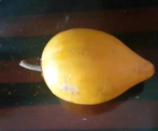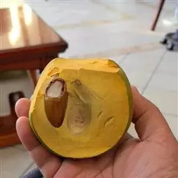 果实球形,未熟时绿色,成熟果黄绿色至橙黄色,光滑,皮薄,果肉橙黄色,富含淀粉,质地似蛋黄且有香气,含水量少,味略甜。其味道口感介乎于番薯和榴莲之间。种子通常1-2粒,近圆形或椭圆形。果实12月成熟,采收后需要后熟4-7天方可食用。