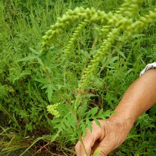 豚草(学名:Ambrosia artemisiifolia L.):一年生草本,高20-150厘米;茎直立,上部有圆锥状分枝,有棱,被疏生密糙毛。下部叶对生,具短叶柄,二次羽状分裂,裂片狭小,长圆形至倒披针形,全缘。上面深绿色,被细短伏毛或近无毛,背面灰绿色,被密短糙毛。雄头状花序半球形或卵形,径4-5毫米,具短梗,下垂,在枝端密集成总状花序。总苞宽半球形或碟形;花冠淡黄色,长2毫米,有短管部,上部钟状,有宽裂片。瘦果倒卵形,无毛,藏于坚硬的总苞中。花期8-9月,果期9-10月。