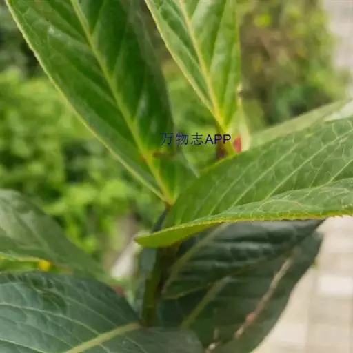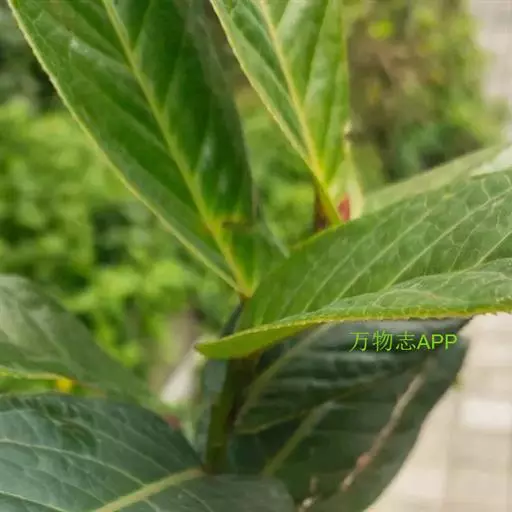 常绿小乔木,高可达7米,嫩枝无毛,紫褐色。单叶,互生,椭圆形或长椭圆形,先端钝尖,基部耳状抱茎,长15-25厘米,宽6-11厘米,边缘具细齿,齿距1-2毫米,无毛。叶面叶脉略凹陷,叶背叶脉凸起。叶柄长3-5毫米。
