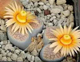 生石花,番杏科生石花属多年生肉质草本植物。植株几乎无茎;花朵较大,颜色艳丽,呈多边形,…