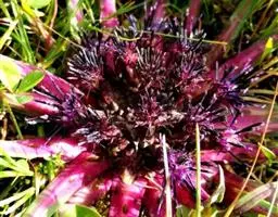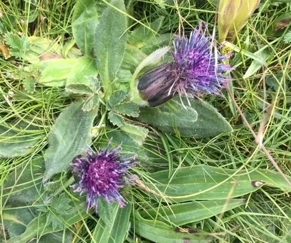 多年生草本,高3-7厘米。根状茎有分枝,颈部被棕色纤维状撕裂的叶柄残迹。茎极短,密被白色绒毛,或无茎。叶莲座状,长圆形或披针形,超出头状花序,长4-11厘米,宽1.2-3.5厘米,顶端急尖或渐尖,基部渐狭成1.5-4厘米的叶柄,边缘全缘或微波状或尖锯齿,上面绿色,被蛛丝状毛及稠密腺点,下面灰白色,密被白色绒毛。头状花序单生于莲座状叶丛中。总苞宽钟状或宽卵形,直径2-3厘米;总苞片5层,外层卵状披针形,长1.6厘米,宽4毫米,顶端渐尖,外面被稀疏的白色绒毛及腺点,中层长椭圆形,长1.6厘米,宽2毫米,上部紫色且被微毛,下部几无毛,内层线形,长2厘米,宽1毫米,外面被稀疏绒毛及腺点,顶端紫色。小花紫红色,长9毫米,细管部长6毫米,檐部长3毫米。瘦果圆柱状,长3毫米,无毛。冠毛污白色,2层,外层短,糙毛状,长1毫米,内层长,羽毛状,长1.3厘米。花果期6-9月。
