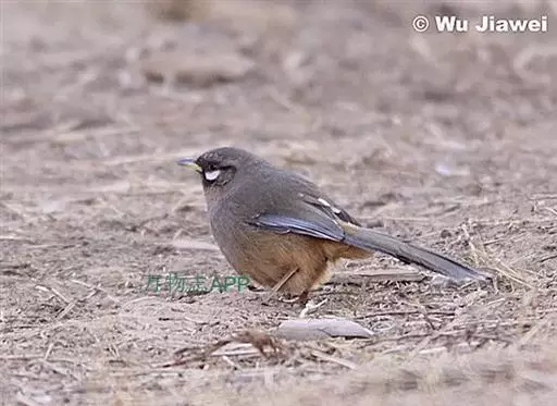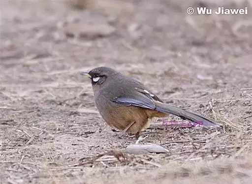 中等体型(28厘米)的酒灰褐色噪鹛。脸颊及耳羽明显为白色,上下各有黑褐色条纹与烟褐色的眼先相接。外侧尾羽混灰色而端白。三级飞羽羽端白。尾上覆羽棕色,臀暖皮黄色。
