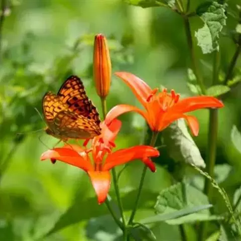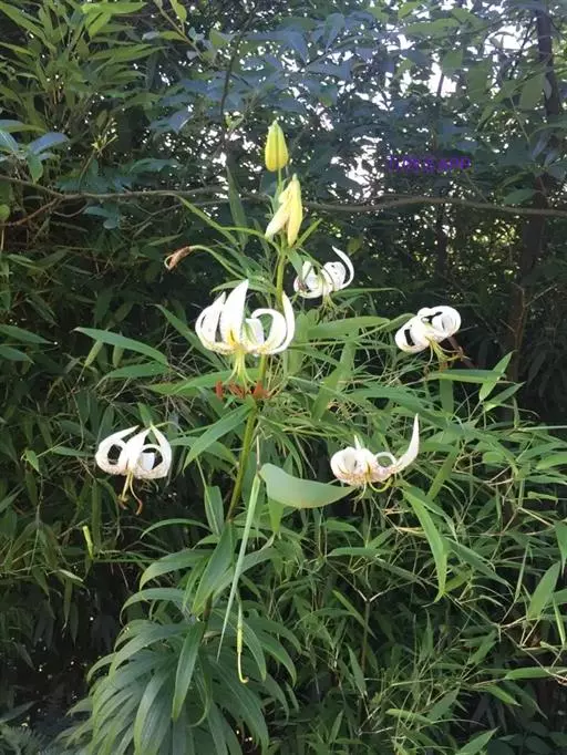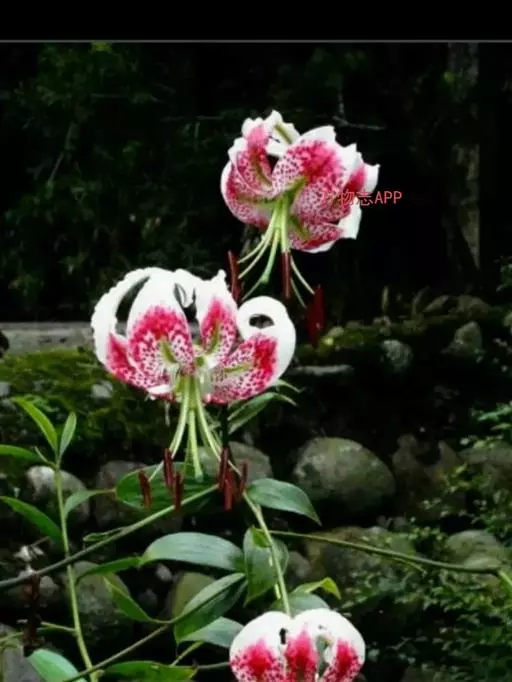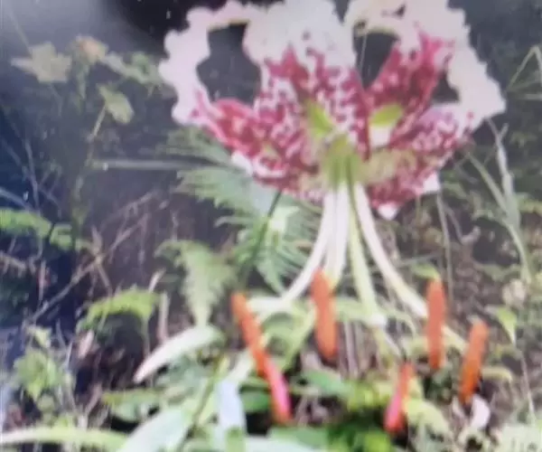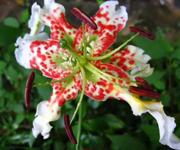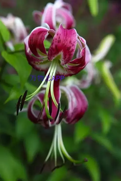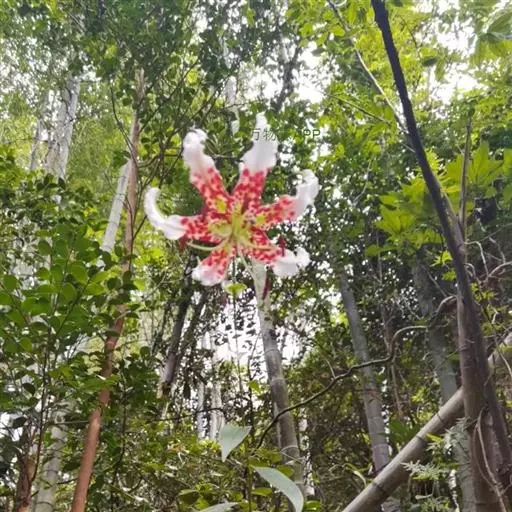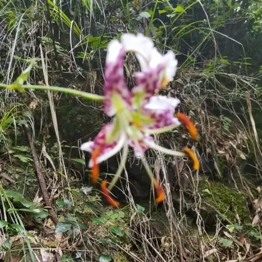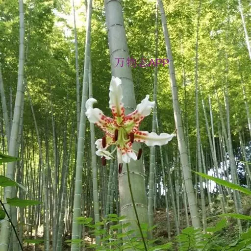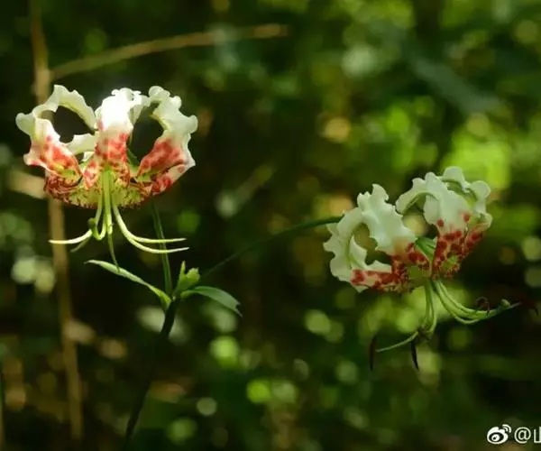 鳞片宽披针形,长2厘米,宽1.2厘米,白色。茎高60-120厘米,无毛。叶散生,宽披针形、矩圆状披针形或卵状披针形,长2.5-10厘米,宽2.5-4厘米,先端渐尖,基部渐狭或近圆形,具3-5脉,两面无毛,边缘具小乳头状突起,有短柄,柄长约5毫米。花1-5朵,排列成总状花序或近伞形花序;苞片叶状,卵形,长3.5-4厘米,宽2-2.5厘米;花梗长达11厘米;花下垂,花被片长6-7.5厘米,反卷,边缘波状,白色,下部1/2-1/3有紫红色斑块和斑点,蜜腺两边有红色的流苏状突起和乳头状突起;雄蕊四面张开;花丝长5.5-6厘米,绿色,无毛,花药长1.5-1.8厘米,绛红色;子房圆柱形,长约1.5厘米;花柱长为子房的2倍,柱头膨大,稍3裂。蒴果近球形,宽3厘米,淡褐色,成熟时果梗膨大。花期7-8月,果期10月。