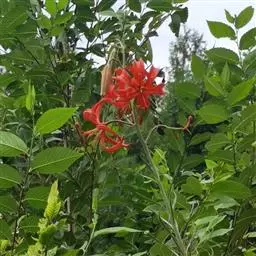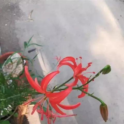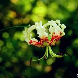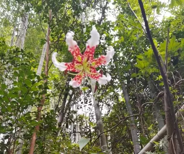 有5条脉,具短柄。花通常1—5朵,成总状花序,下垂,花不为喇叭状或钟状,也无花被管,花被片6,长约10厘米,宽2厘米,纯白色,反卷,边缘成波状,1/3—1/2外有红色斑块和斑点,蜜腺两边具红色流苏状突起,雄蕊上端常向外张开,花丝绿色,无毛,苞片长1.5厘米,绛红色,子房圆柱形,长1.5厘米,花柱长为子房的2倍,柱头微裂。蒴果近球形,直径约3厘米,成熟时果梗膨大。