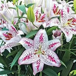 药百合是原产在日本的美丽百合L.speciosum Thunb.的一个变种,它与本种的主要区别是鳞茎为球形,叶7~9脉,花朵芳香。