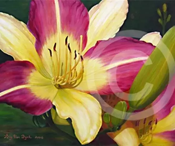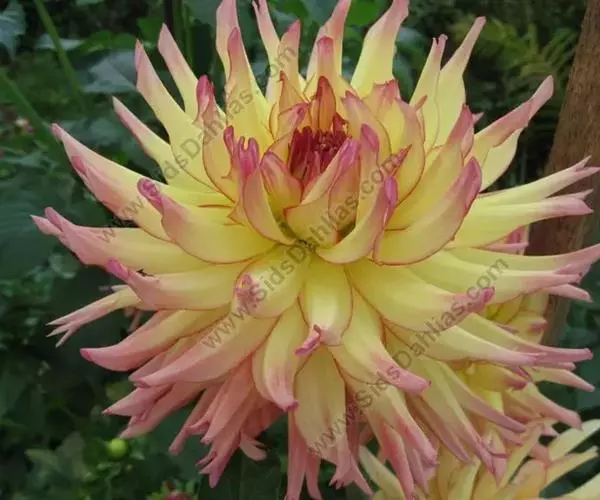 朝影:花鲜黄色,花瓣先端白色,重叠圆厚,不露花心,花径12厘米。株高120厘米。易栽培。