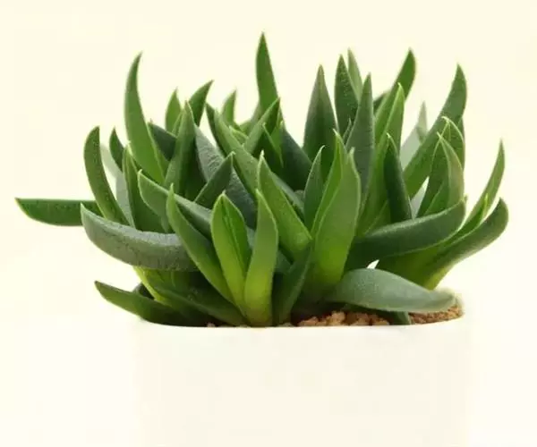 每单生植株基部有6-8枚叶片,放射状排列;叶高度肉质,柔软,长3-5厘米,宽0.6-1厘米;倒三棱线形,正面平坦,背部具以龙骨状凸起;叶对生,基部合生,呈白色,先端逐渐变细;表皮光滑,绿色至墨绿色,密布透明小斑点。