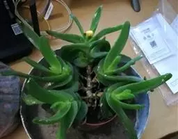 照波,番杏科多肉植物、 此种生长较快,栽培容易,细长的浓绿色叶3厘米左右,开黄色花。 浇水也是以干湿交替进行,但要防止长期干旱与湿涝。夏季高温需遮阴,忌暴晒。