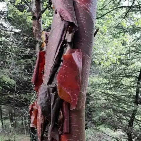 岳桦是乔木的一种。高8-15 (20)米;树皮灰白色,成层、大片剥裂。枝条红褐色,无毛;幼枝暗绿色,密被长柔毛,稍有树脂腺体;芽鳞密被白色绒毛。