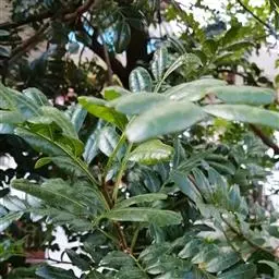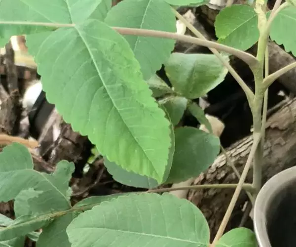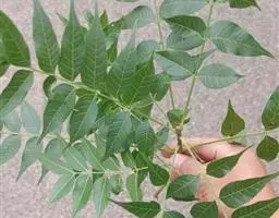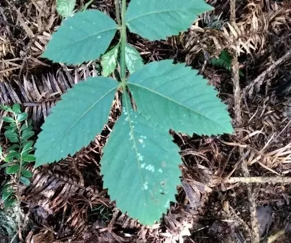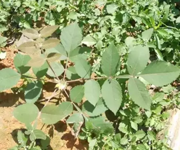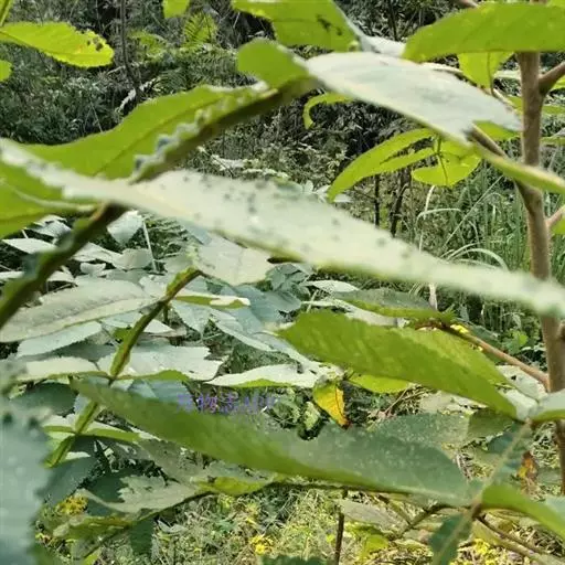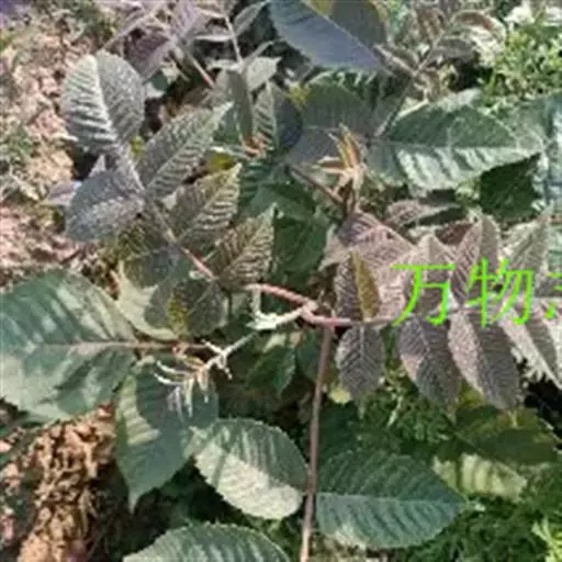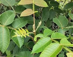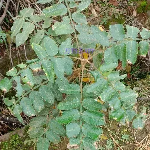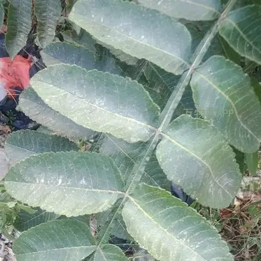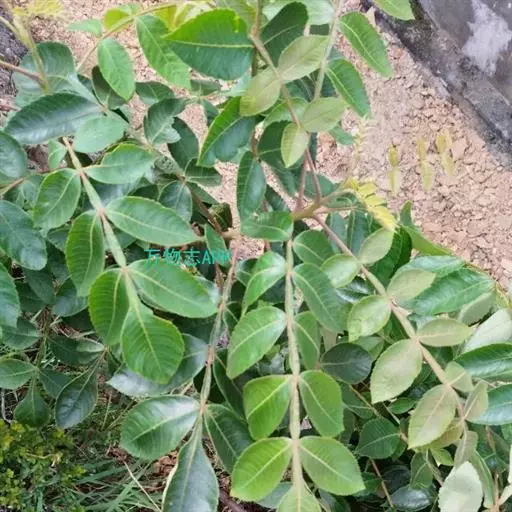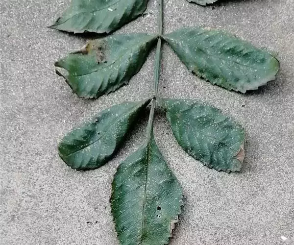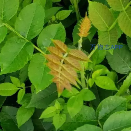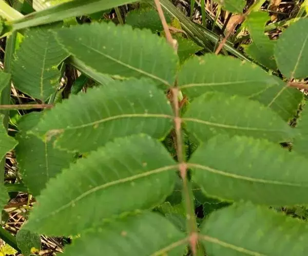 奇数羽状复叶有小叶(2-)3-6对,纸质,边缘具粗钝锯齿,背面密被灰褐色毛,叶轴具宽的叶状翅,小叶自下而上逐渐增大,叶轴和叶柄密被锈色柔毛;小叶多形,卵形或椭圆状卵形或长圆形,长6-12厘米,宽3-7厘米,先端急尖,基部圆形,顶生小叶基部楔形,边缘具粗锯齿或圆齿,叶面暗绿色,叶背粉绿色,被白粉,叶面沿中脉疏被柔毛或近无毛,叶背被锈色柔毛,脉上较密,侧脉和细脉在叶面凹陷,在叶背突起;小叶无柄。