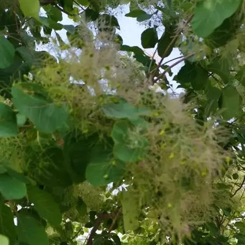 粉背黄栌叶卵圆形,较大,长3.5-10厘米,宽2.5-7.5厘米,无毛,但叶背显著被白粉;叶柄较长,…
