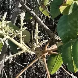 圆锥花序宽大,多分枝,雄花序长30-40厘米,雌花序较短,密被锈色柔毛;苞片披针形,长约1毫米,被微柔毛,小苞片极小,花乳白色,花梗长约1毫米,被微柔毛;雄花:花萼外面被微柔毛,裂片长卵形,长约1毫米,边缘具细睫毛;花瓣倒卵状长圆形,长约2毫米,开花时外卷;雄蕊伸出,花丝线形,长约2毫米,无毛,花药卵形,长约0.7毫米;子房不育;雌花:花萼裂片较短,长约0.6毫米,外面被微柔毛,边缘具细睫毛;花瓣椭圆状卵形,长约1.6毫米,边缘具细睫毛,里面下部被柔毛;雄蕊极短;花盘无毛;子房卵形,长约1毫米,密被白色微柔毛,花柱3, 柱头头状。