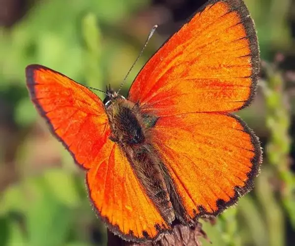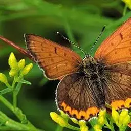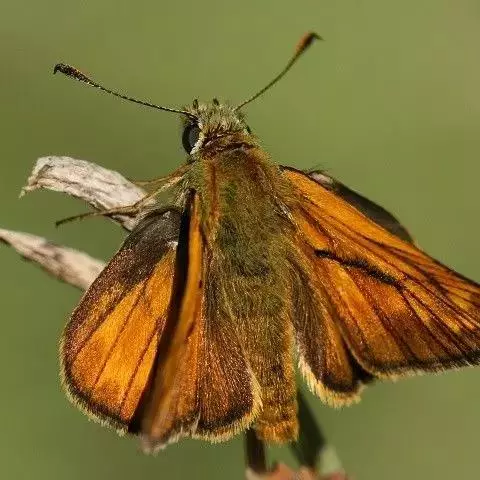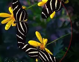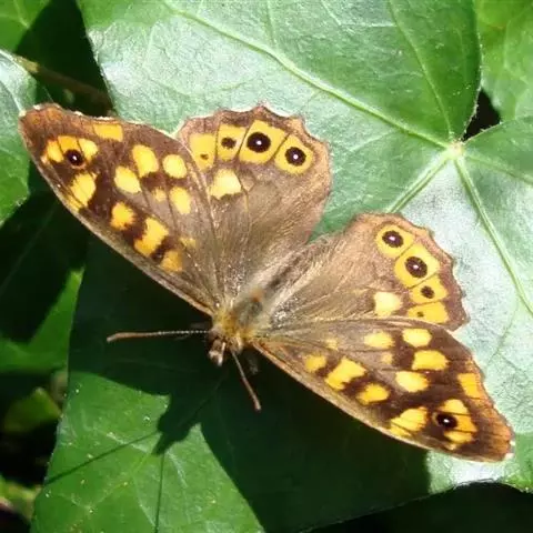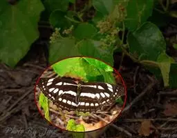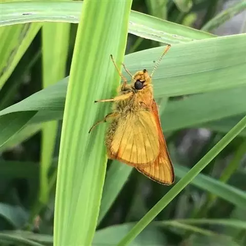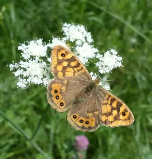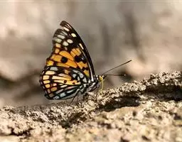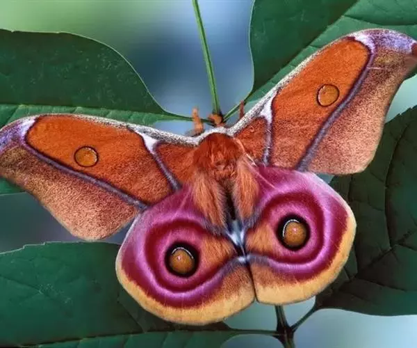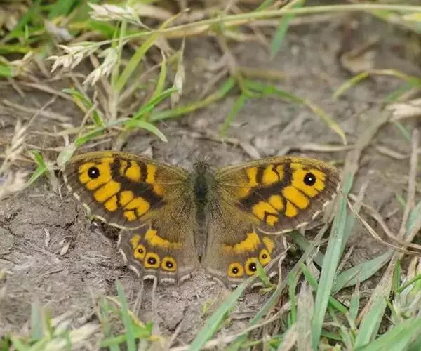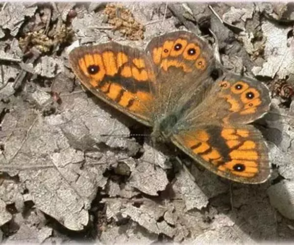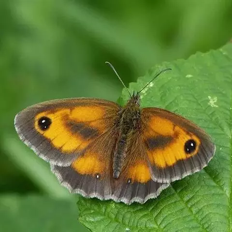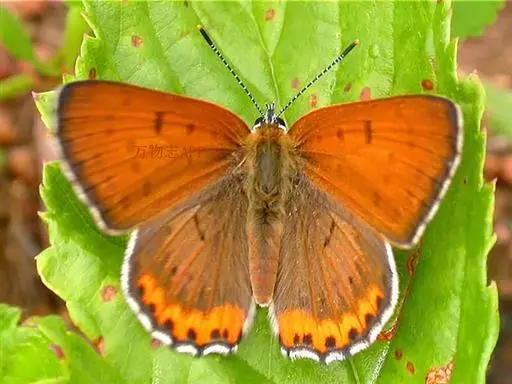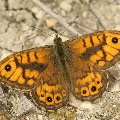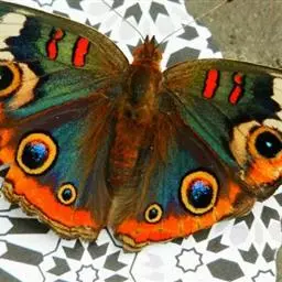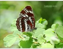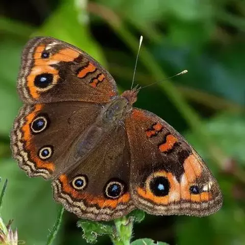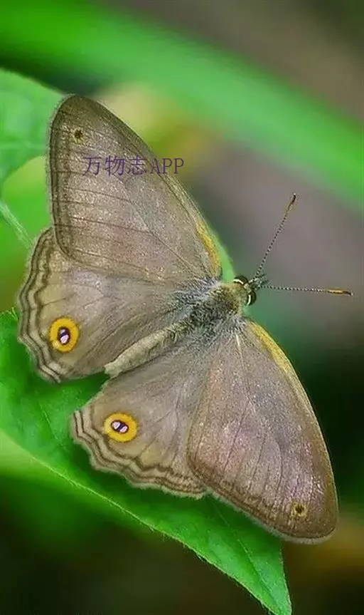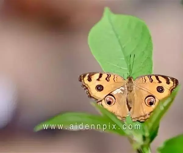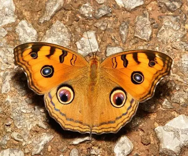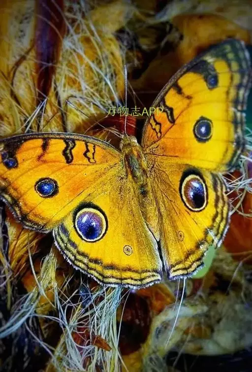美眼蛱蝶Junonia almana(linnaeus),雄蝶翅展54mm,52mm。翅橙红色,前后翅外缘各有3条黑褐色波状线,翅面各有2个眼斑,前翅眼斑上小下大,后翅眼斑上大下小。前翅前缘褐色,有4个肾形斑,其中基部肾形斑中空,端部1肾形斑与小眼斑相连。该种分夏型和秋型:夏型翅缘较整齐,反面眼斑明显;秋型翅缘有突起,反面呈枯叶状 。幼虫黑褐色,密生枝刺。