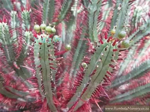 红彩云阁是彩云阁的栽培品种。原种彩云阁产于纳米比亚,其形态为多分枝灌木,分枝全部向上生长。3—4棱,通常3棱,粗4—6厘米、长15—25厘米,但在栽培中分枝较细而更长。棱缘有坚硬短齿。表皮深绿色有白色晕纹。对生刺红褐色,0.3—0.4厘米长。在分枝上部每棱上都有卵圆形带短尖的绿色叶,叶长3—5厘米,叶质很薄。冬季寒冷时会落叶,翌年5月萌发新叶。