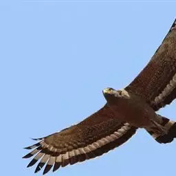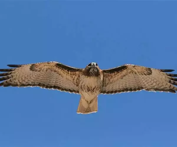 大鵟体长57-71厘米,体重1320-2100克。它的体色变化较大,分暗型、淡型两种色型。暗型上体暗褐色,肩和翼上覆羽缘淡褐色,头和颈部羽色稍淡,羽缘棕黄色,眉纹黑色,尾淡褐色,具6条淡褐色和白色横斑,羽干及羽缘白色,翅暗褐色,飞羽内翈基部白色,次级飞羽及内侧覆羽具暗色横斑,内翈边缘白色并具暗色点斑,翅下飞羽基部白色,形成白斑。下体淡棕色,具暗色羽干纹及横纹。覆腿羽暗褐色;淡型头顶、后颈几为纯白色,具暗色羽干纹。眼先灰黑色,耳羽暗褐,背、肩、腹暗褐色,具棕白色纵纹的羽缘。尾羽淡褐色,羽干纹及外侧尾羽内翈近白色,具8-9条暗褐色横斑,尾上覆羽淡棕色,具暗褐色横斑,飞羽的斑纹与暗型的相似,但羽色较暗型为淡。下体白色淡棕,胸侧、下腹及两胁具褐色斑,尾下腹羽白色,覆腿羽暗褐色。大鵟虹膜黄褐色,嘴黑褐色,腊膜绿黄色,跗跖和趾黄褐色,爪黑色。