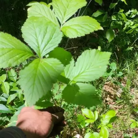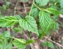 三出复叶,小叶几无柄,倒卵形或菱状卵形,长1-5厘米,宽0.8-3.5厘米,顶端圆钝或急尖,顶生小叶基部楔形,侧生小叶基部偏斜,边缘有缺刻状锯齿,上面绿色,散生疏柔毛,下面淡绿色,有疏柔毛,沿叶脉较密;叶柄被开展柔毛有时上部较密。