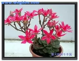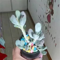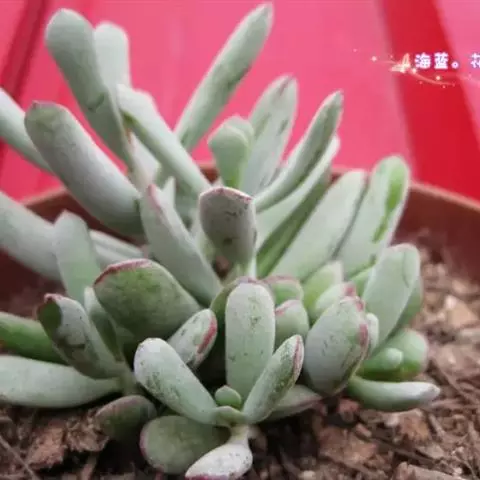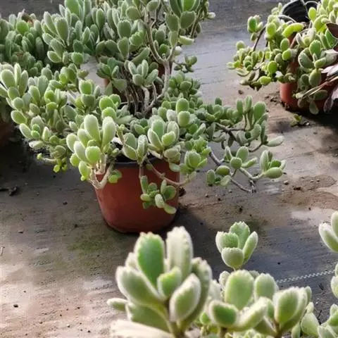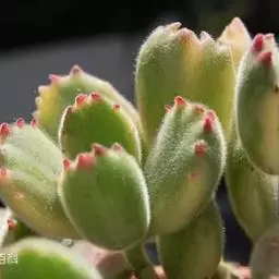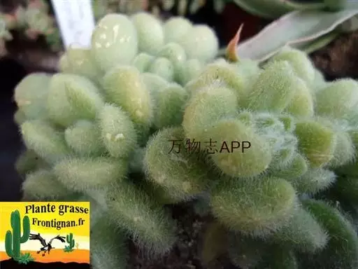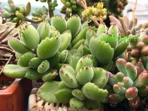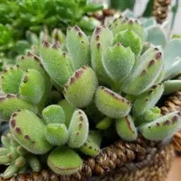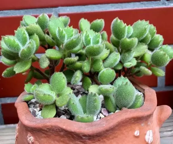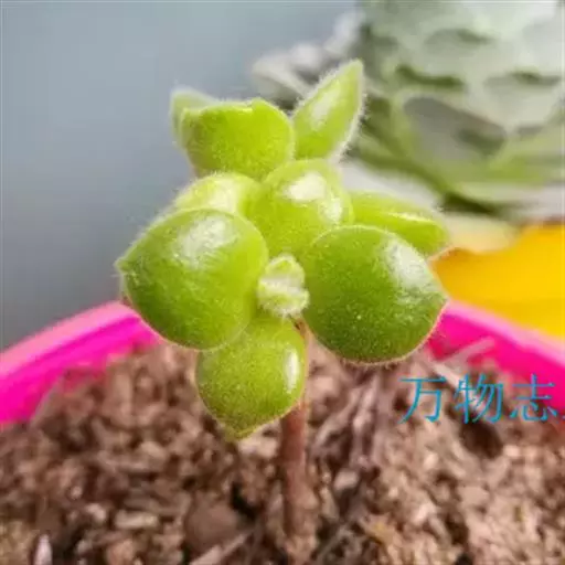 熊童子为景天科银波锦属多肉植物,株形不大,分枝繁多,玲珑秀气,体形文雅,独特漂亮,可作室内小型盆栽。绿色叶片密布白色绒毛,很像熊掌,可用小型工艺盆栽种点缀书桌、窗台等处,也可用为品种收集栽培。