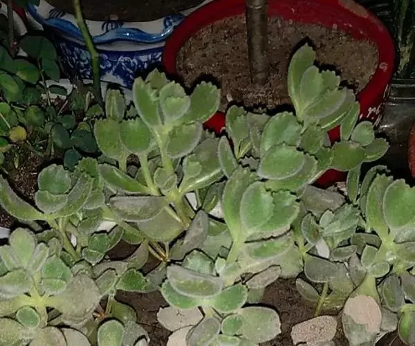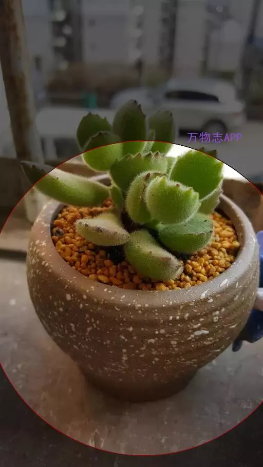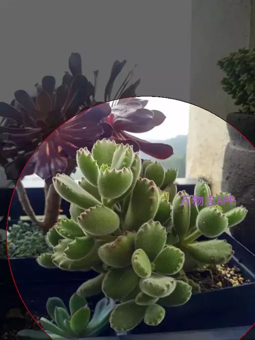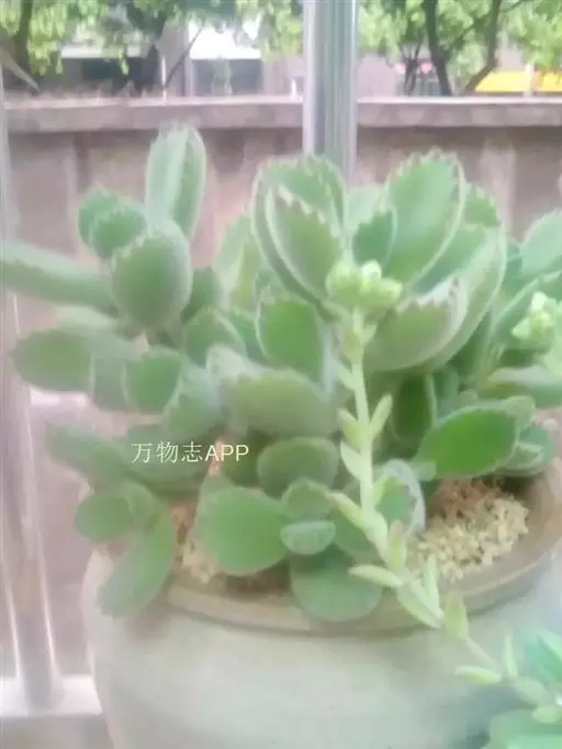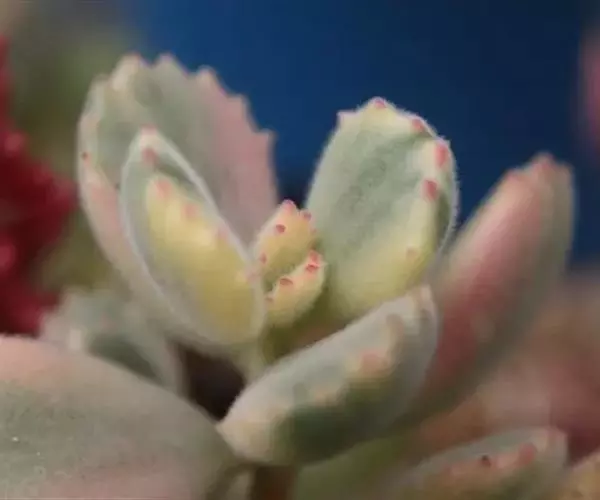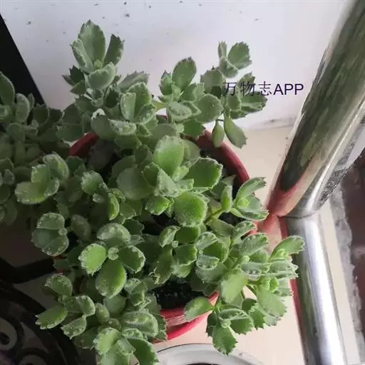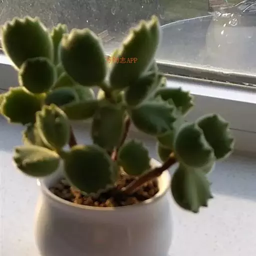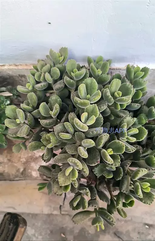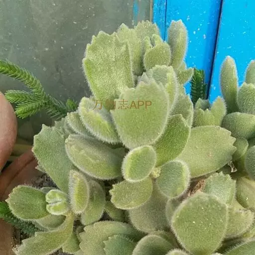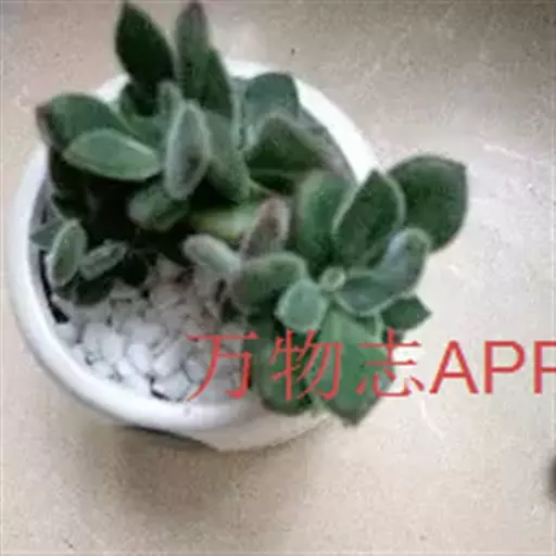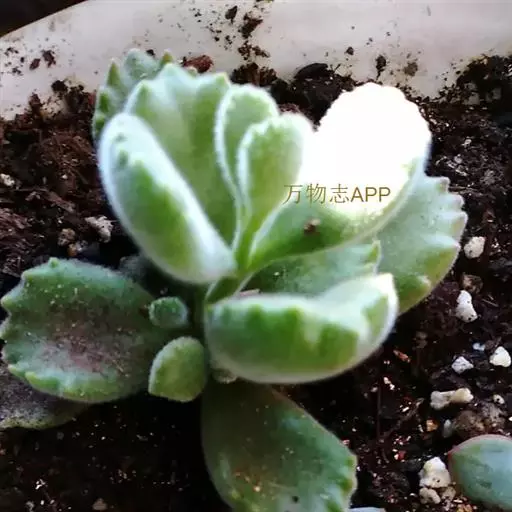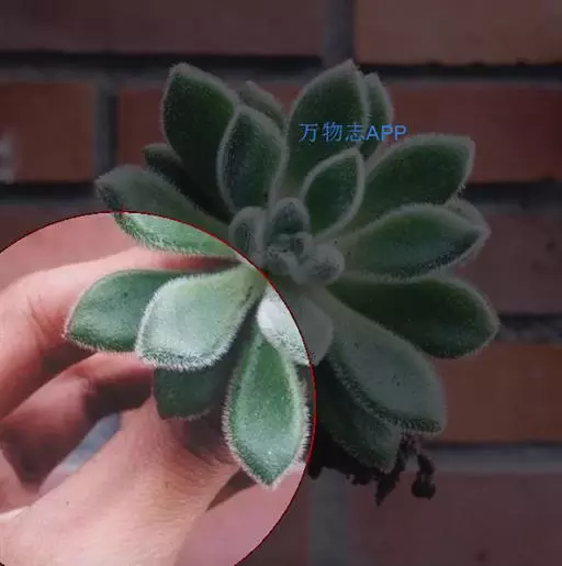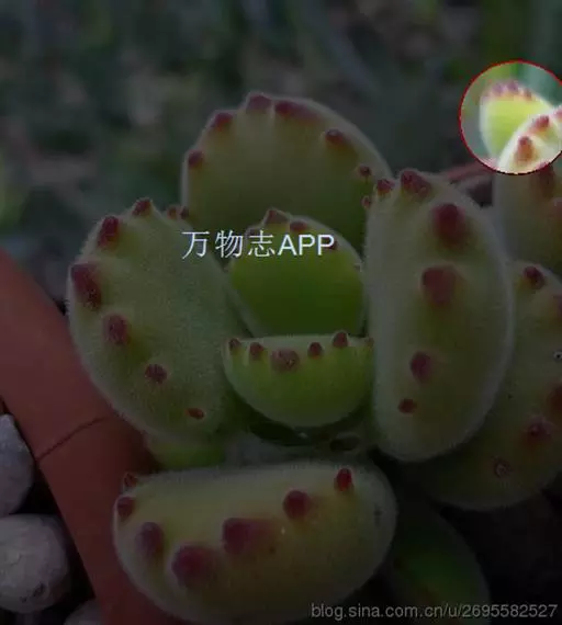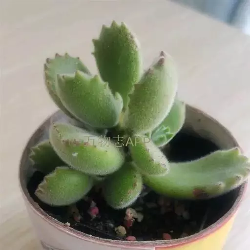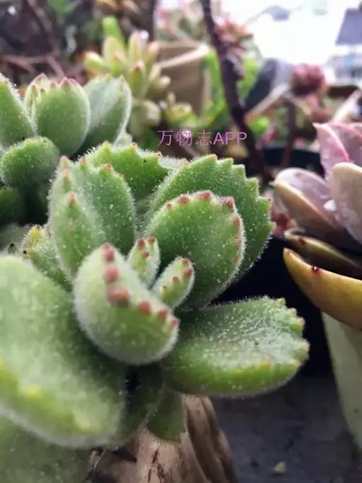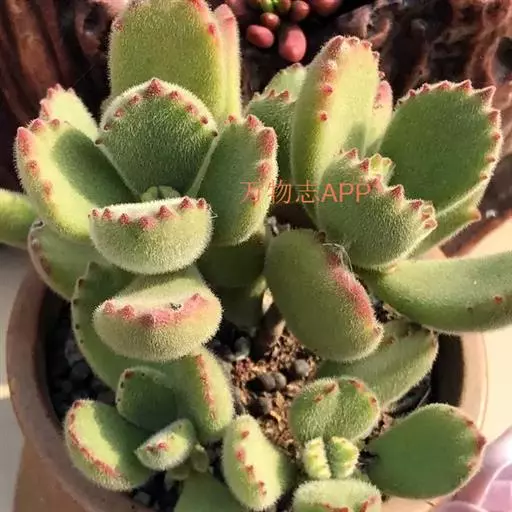 叶片肥厚肉质,倒披针形至长卵圆形,扁匙状,交互对生,长2.3-6.5厘米,宽1.5-3.2厘米;叶表绿色,表面密被白色极细短绒毛,叶端具缺刻,前1/3部分具红色爪样齿,形似熊掌。