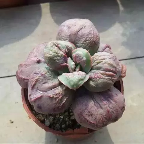 株高在15厘米以内,在植株成长过程中下部的叶片逐渐凋落,在茎的顶端排成像莲花的外观,肉质叶,叶片的外缘一圈紫红色边,叶面偶有散生一些紫红色斑点;可采用摘叶叶插和分株繁殖。