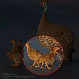 刚出壳的雏鸟嘴为黑褐色,虹膜栗色,脚黄褐色,全身披着绒羽,头顶、颈的上部为栗色,头的两侧各有一条淡黄白色的纵纹,下体喉部为污白色,其余均为浅灰褐色。初生雏鸟的量度为全长96-125毫米,嘴峰长9-10毫米,翅长50-55毫米,尾长25-28毫米,跗跖长24-28毫米。雏鸟出壳后不久就能随亲鸟离巢觅食,遇到危险时,雌鸟首先一边惊叫,一边逃离,雏鸟随即四散奔逃,很快钻进草丛或岩缝之中,直到危险过后,雌鸟返回,发出召唤声时,它们才从隐匿处走出。