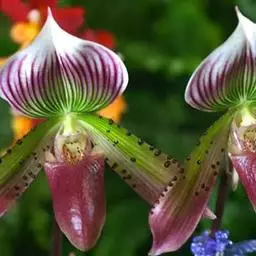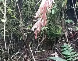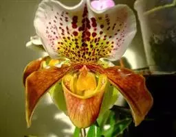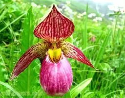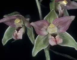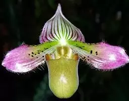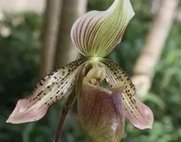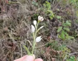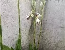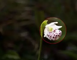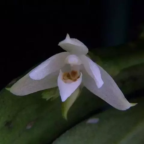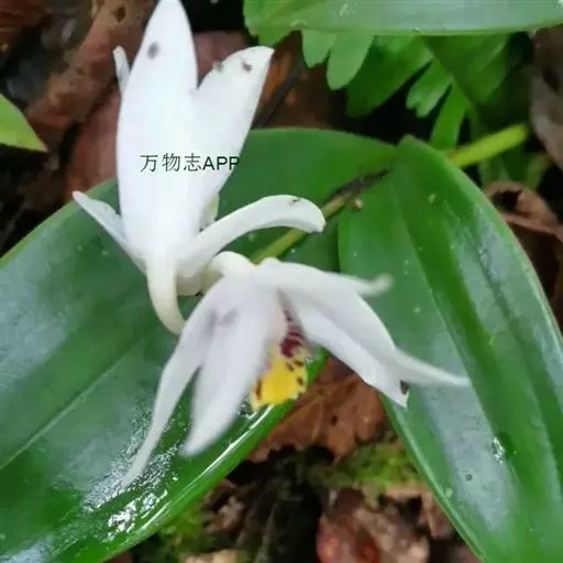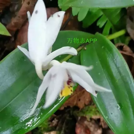 花序1个,自两叶片之间发出,长10-30厘米,具2-6朵花,上部常弯曲,基部具1枚鞘状物;花苞片通常披针形或线形,长5毫米,宽近1毫米,极少卵状披针形,长达8毫米,宽3毫米;花梗和子房长约1.5厘米;花白色,唇瓣上有紫色斑纹;中萼片椭圆状披针形,长约17毫米,宽约5毫米,先端钝;侧萼片镰状披针形,长约15毫米,宽近5毫米,先端钝,基部与蕊柱足合生成明显的萼囊。