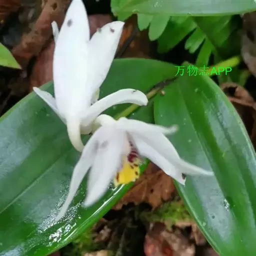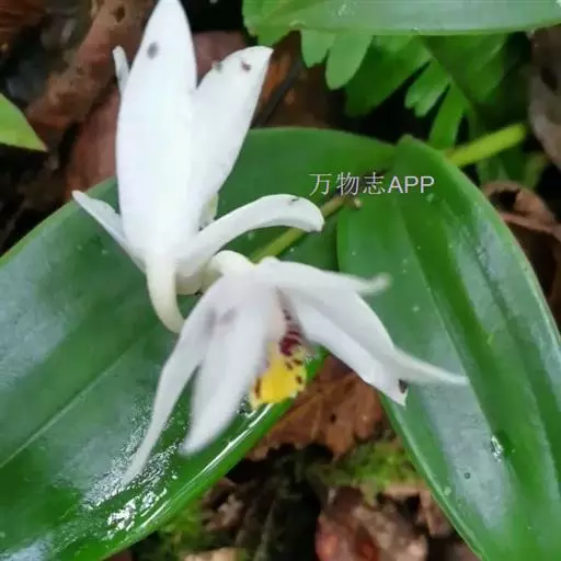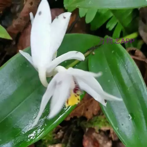 足茎毛兰(学名:Eria coronaria (Lindl.) Rchb. f.):植物体无毛,干后全体变黑,具根状茎;根状茎上常有漏斗状革质鞘,假鳞茎密集或每隔1-2厘米着生,不膨大,圆柱形。叶2枚着生于假鳞茎顶端,1大1小,长椭圆形或倒卵状椭圆。花序1个,自两叶片之间发出,具2-6朵花;花白色,唇瓣上有紫色斑纹;花瓣长圆状披针形,与中萼片近等长,宽约4.5毫米,先端钝;唇瓣轮廓长圆形,长14-15毫米,宽11-12毫米,3裂。蒴果倒卵状圆柱形,长约2厘米;果柄长约3毫米。花期5-6月。