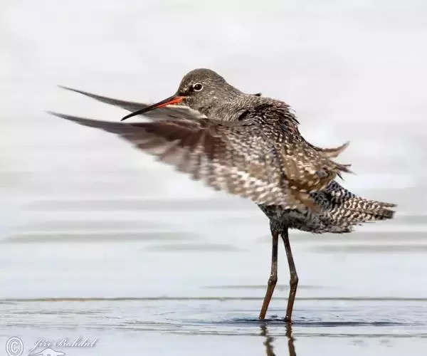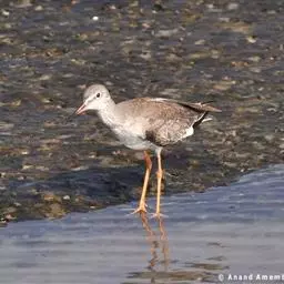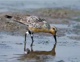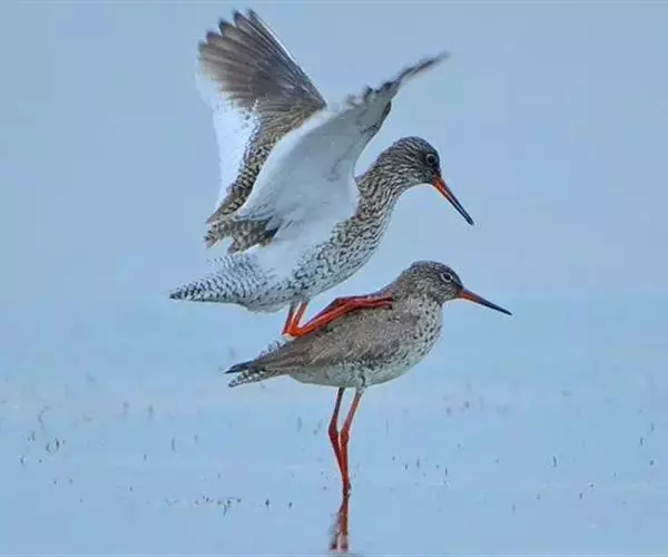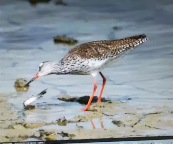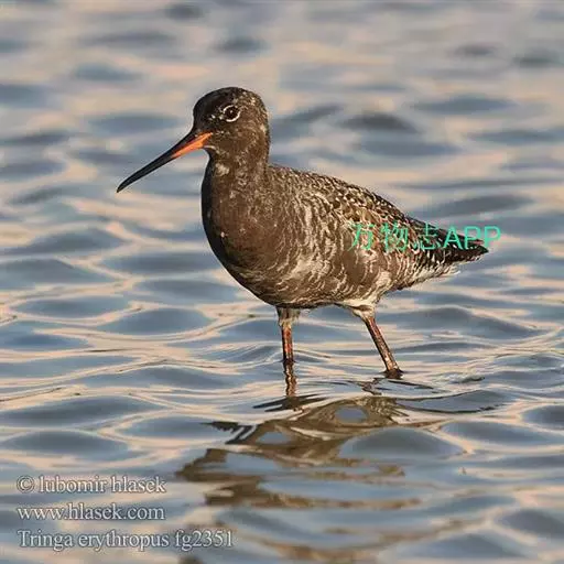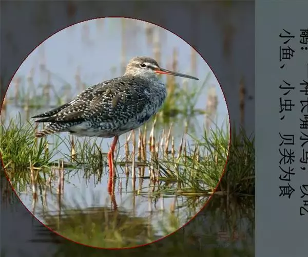 红脚鹬(学名:Tringa totanus):体长28厘米,上体褐灰,下体白色,胸具褐色纵纹。飞行时腰部白色明显,次级飞羽具明显白色外缘。尾上具黑白色细斑。虹膜黑褐色,嘴长直而尖,基部橙红色,尖端黑褐色。脚较细长,亮橙红色,繁殖期变为暗红色。幼鸟橙黄色。