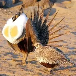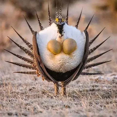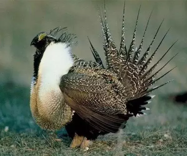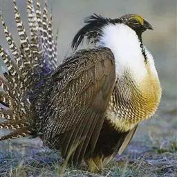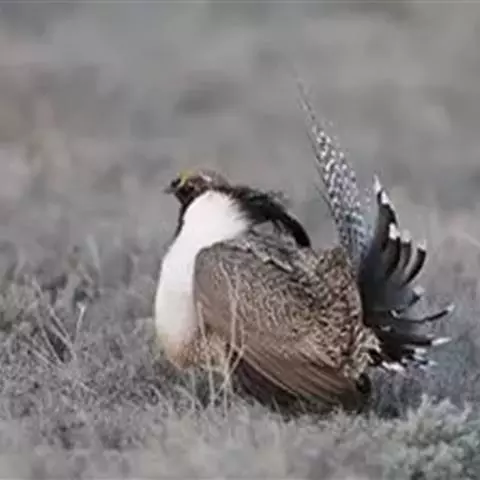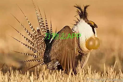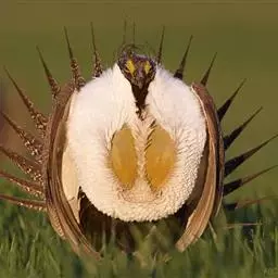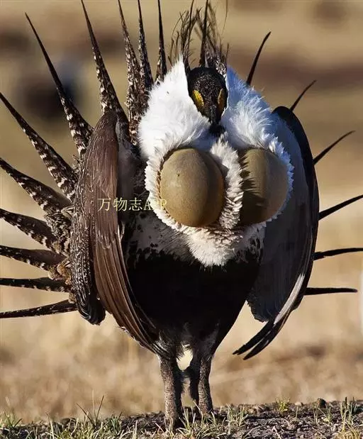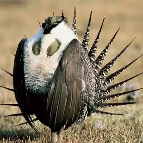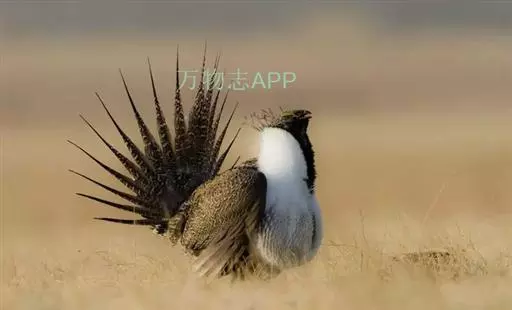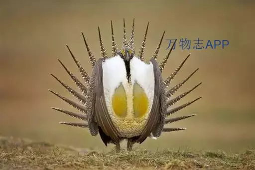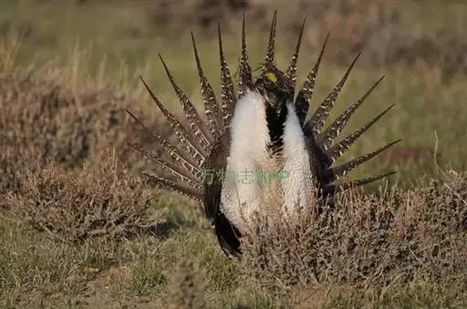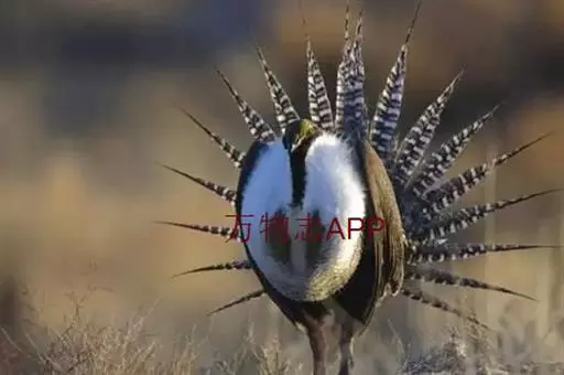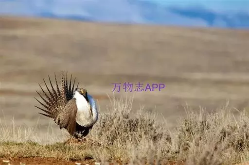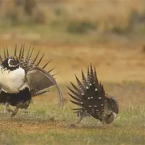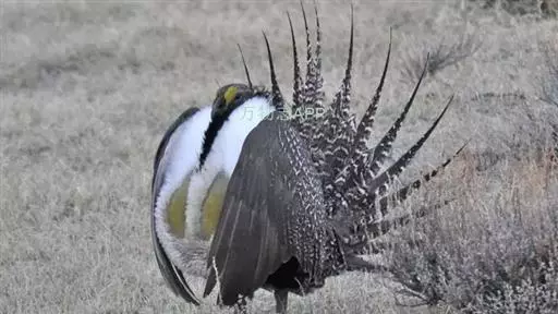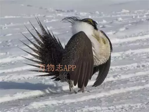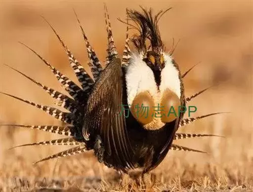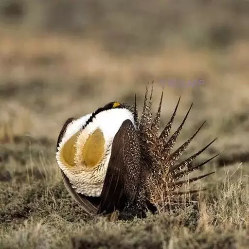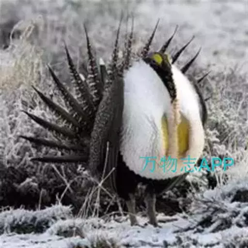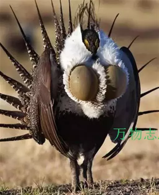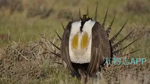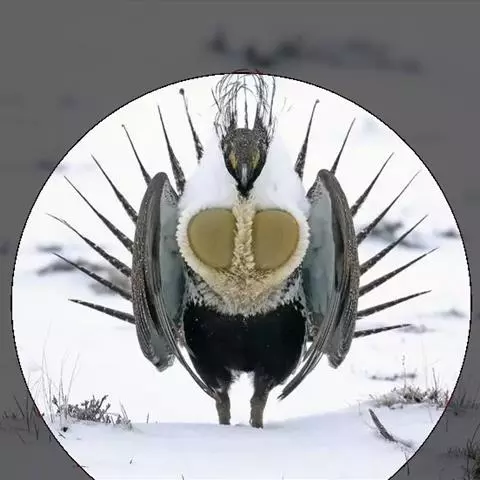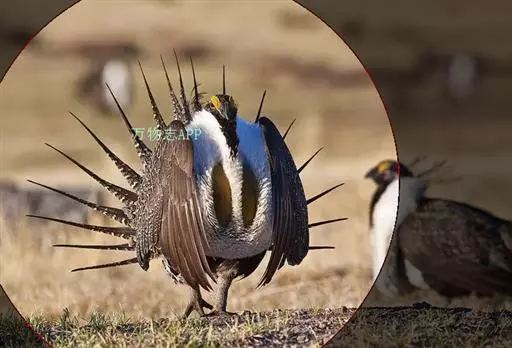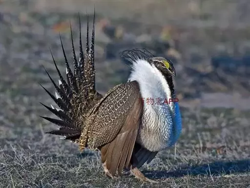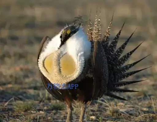 艾草松鸡(学名:Centrocercus urophasianus):是北美洲最大的松鸡。身高48-76厘米,体重2300-3200克。雄性大于雌性,更重。雄性长着两个大胸,雌性却没有胸。 颈上有两个黄色的囊,可以在求偶时充气以吸引异性。走禽,体结实,喙短,呈圆锥形,适于啄食植物种子;翼短圆,不善飞;脚强健,具锐爪,善于行走和掘地寻食。雄鸟具大的肉冠和美丽鲜艳的羽毛,早成鸟,鼻孔和脚均有被羽,以适应严寒。