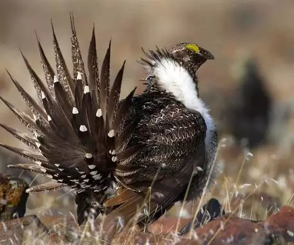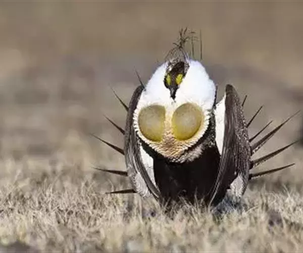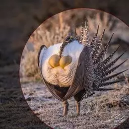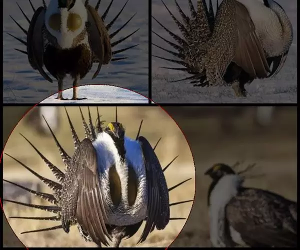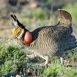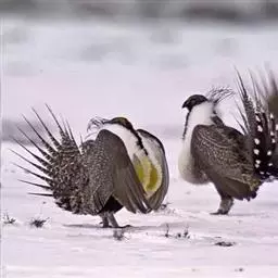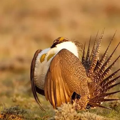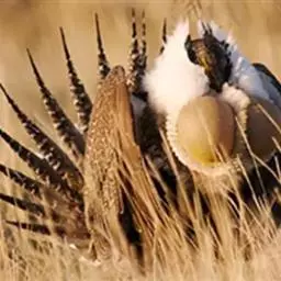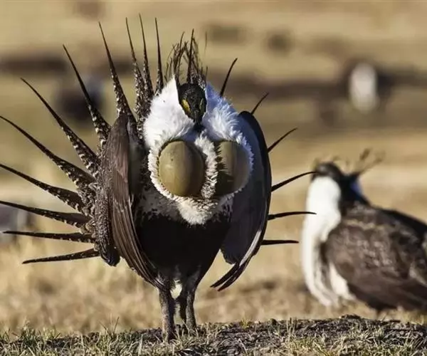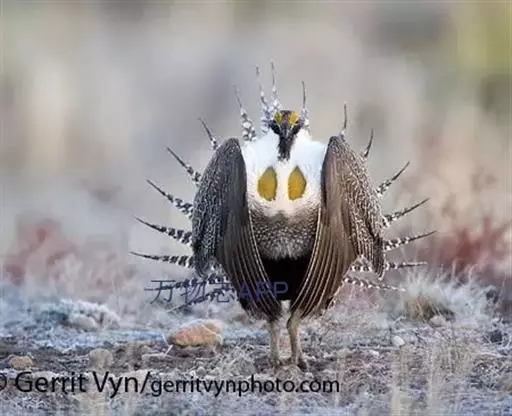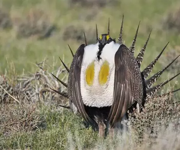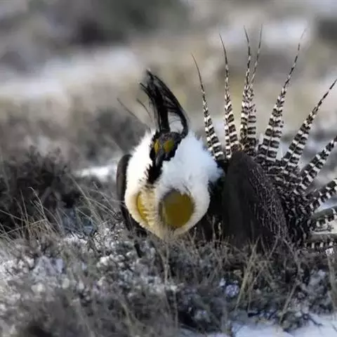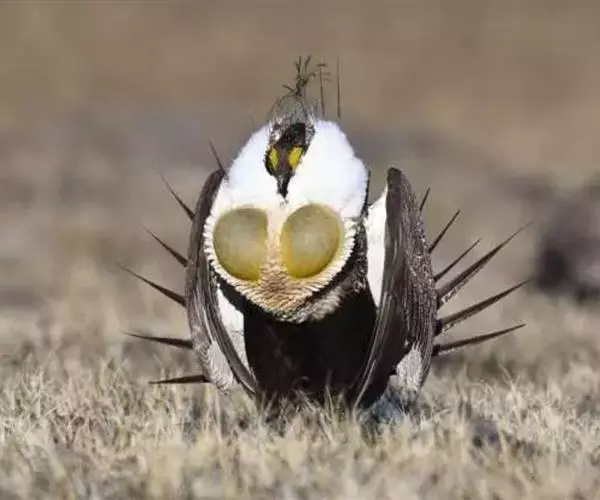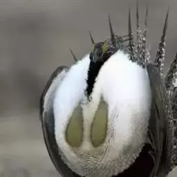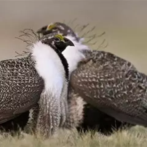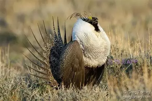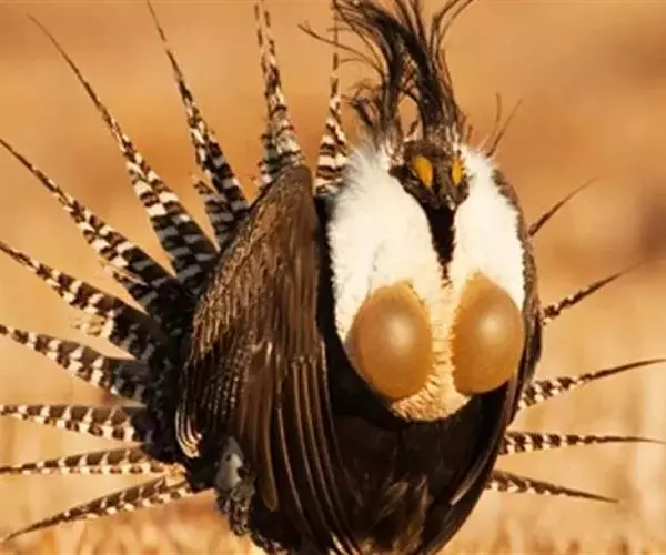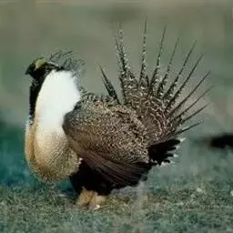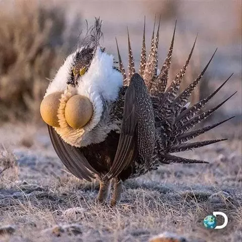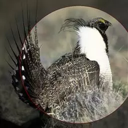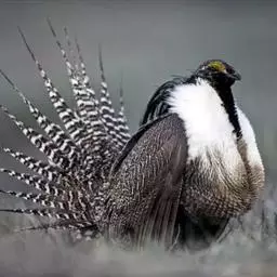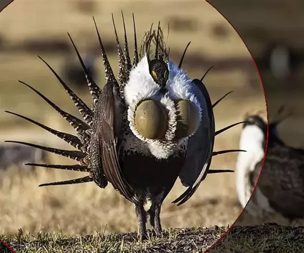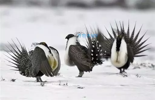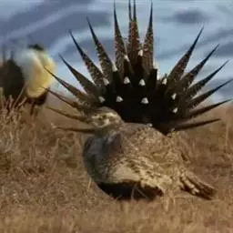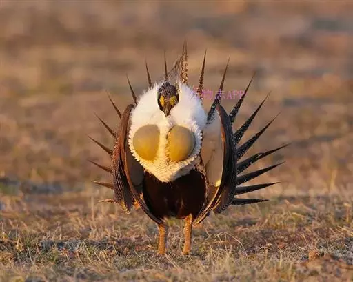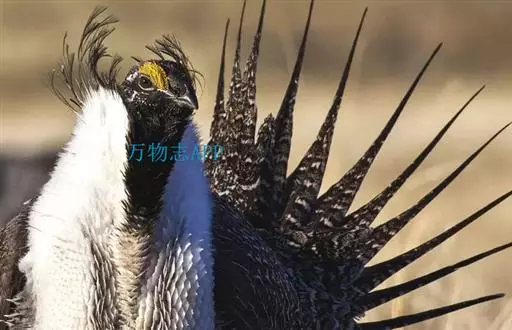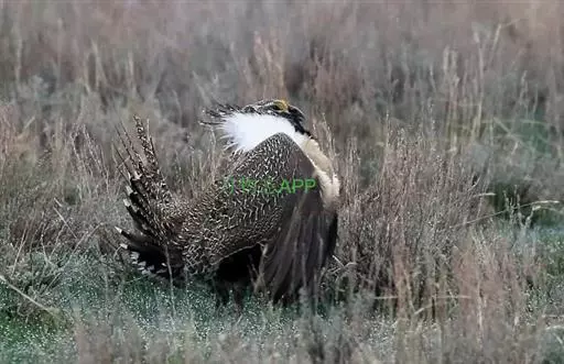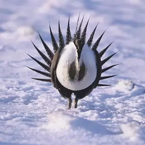 艾草松鸡(学名:Centrocercus urophasianus):是北美洲最大的松鸡。身高48-76厘米,体重2300-3200克。雄性大于雌性,更重。雄性长着两个大胸,雌性却没有胸。 颈上有两个黄色的囊,可以在求偶时充气以吸引异性。走禽,体结实,喙短,呈圆锥形,适于啄食植物种子;翼短圆,不善飞;脚强健,具锐爪,善于行走和掘地寻食。雄鸟具大的肉冠和美丽鲜艳的羽毛,早成鸟,鼻孔和脚均有被羽,以适应严寒。