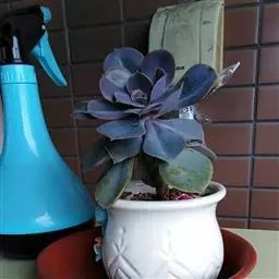 紫珍珠是景天科石莲花属的多年生肉质草本植物。植株中小型;叶片肉质,匙形,呈莲座状紧密排列;叶片粉紫色,…