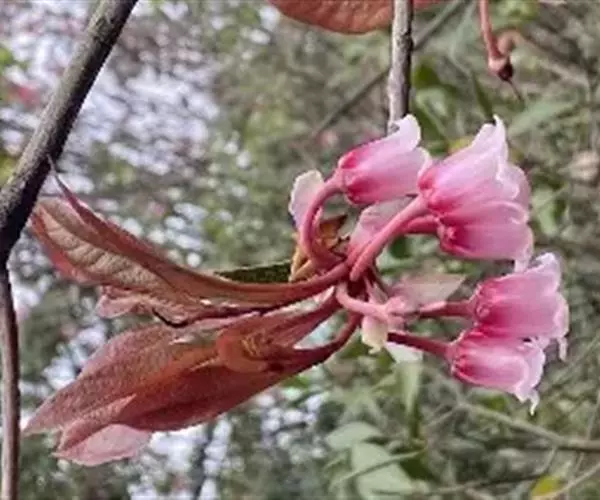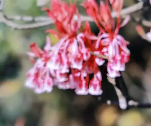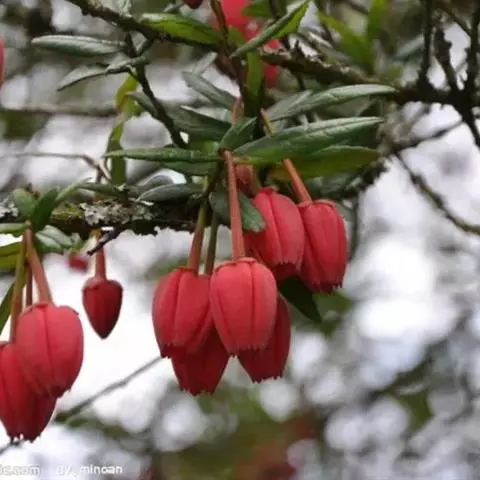 花两性,单一,稀成对生于茎枝顶叶腋,下垂;花梗纤细,淡绿色或带红色,长3-7厘米;花管红色,筒状,上部较大,长1-2厘米,径3-5毫米,连同花梗疏被短柔毛与腺毛;萼片4,红色,长圆状或三角状披针形,长2-3厘米,宽4-8毫米,先端渐狭,开放时反折;花瓣色多变,紫红色,红色、粉红、白色,排成覆瓦状,宽倒卵形,长1-2.2厘米,先端微凹;雄蕊8,外轮的较长,花丝红色,伸出花管外的长1.8-3厘米,花药紫红色,长圆形,长2-3毫米,径约1毫米,花粉粉红色;子房倒卵状长圆形,长5-6毫米,径3-4毫米,疏被柔毛与腺毛,4室,每室有多数胚珠;花柱红色,长4-5厘米,基部围以绿色的浅杯状花盘;柱头棍棒状,褐色,长约3毫米,径约1.5毫米,顶端4浅裂。果紫红色,倒卵状长圆形,长约1厘米。花期4-12月。