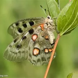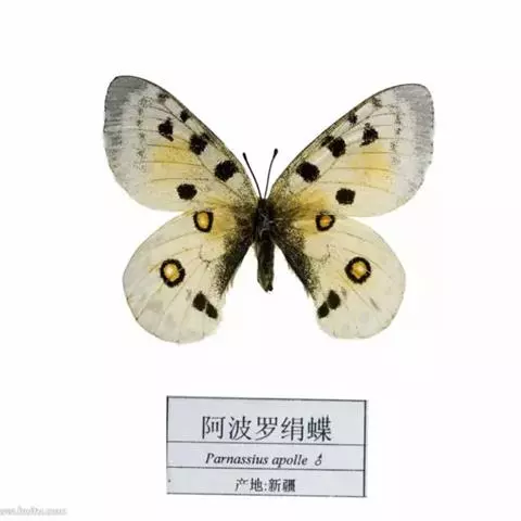 阿波罗绢蝶:翅展约7-8.4厘米。前翅较圆,白垩色,翅表有许多黑点、灰白斑及无鳞透明区,…