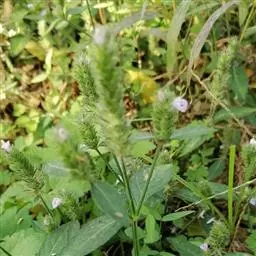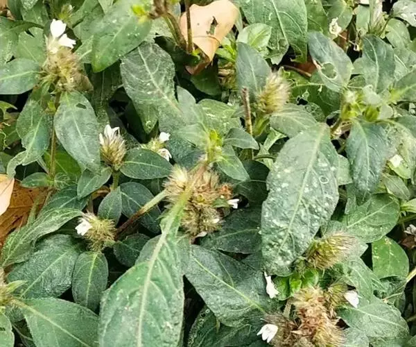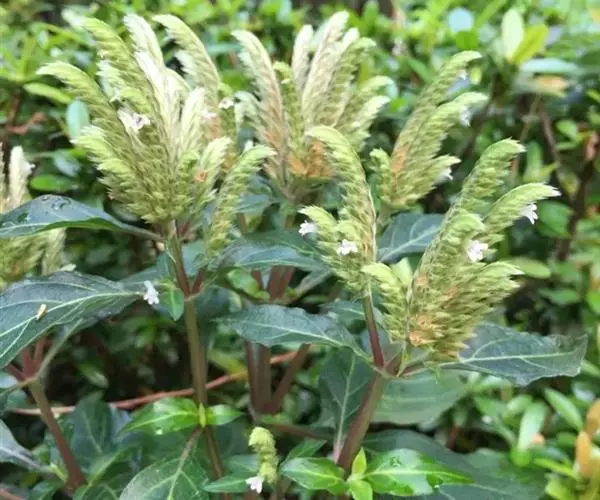 鳞花草 直立、多分枝草本,高可达1米;小枝4棱,除花序外几全体无毛。叶纸质,长圆形至披针形,有时近卵形,长4-10厘米,宽1-3.5厘米,顶端渐尖或短渐尖,钝头,基部多少下延,通常浅波状或有疏齿,上面光亮,两面均有稍粗的针状钟乳体;侧脉每边7-9条;叶柄长5-10毫米。穗状花序顶生和近枝顶侧生,卵形,长1-3厘米;苞片长圆状卵形,长约7毫米,顶端具刺状小凸起;小苞片稍狭,和苞片及萼裂片均在背面和边缘被长柔毛;花萼后裂片较大,披针状卵形,长约7毫米,前裂片中部以下合生;花冠白色,长约7毫米,喉部内面密被倒生、白色长柔毛,上唇直立,阔卵形,不明显2裂,下唇裂片近圆形;花药2室,药室邻接,斜叠生,花粉粒长球形,42(40-45)微米×28 (26-29)微米,具3孔沟,沟长,两端尖,表面具网状雕纹;花柱无毛。蒴果长圆形,长约6毫米,无毛;种子每室2粒。花期早春。