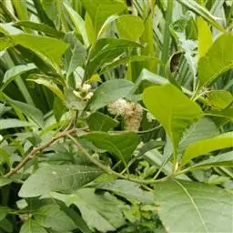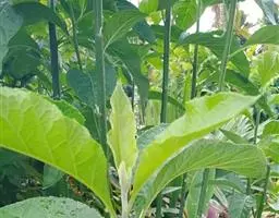扁桃斑鸠菊(学名:Vernonia amygdalina Delile)是菊科、斑鸠菊属旱生型灌木或小乔木,高可达6米。叶互生,叶片长卵形,先端尖,叶面亮灰绿色,背面灰白色,有特殊气味和辣味。叶不下延,羽状脉,头状花序顶生或腋生,总苞片数层,花两性,花冠管状,乳白色至粉红色。总苞向外渐短,常具腺;花托平,檐部上端具裂片;花药顶端尖,基部箭形或钝,具小耳;花柱分枝细,钻形,顶端稍尖,被微毛;瘦果顶端截形,基部常具胼胝质,被常具腺;冠毛内层细长,糙毛状,外层极短。