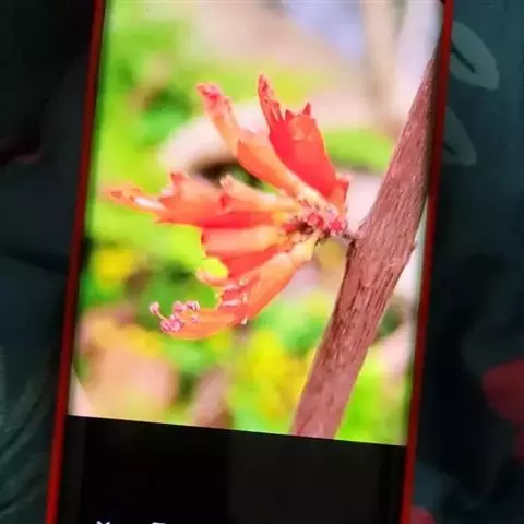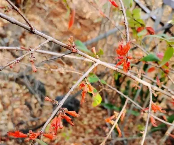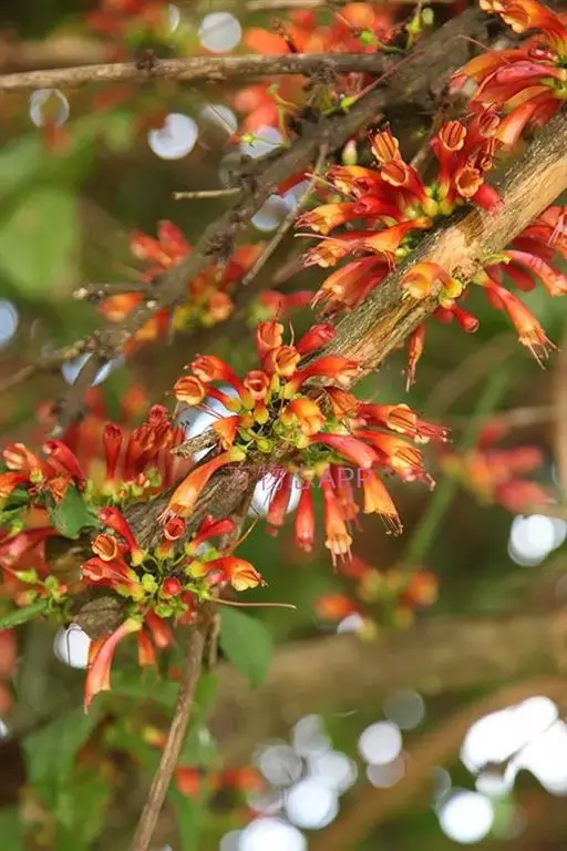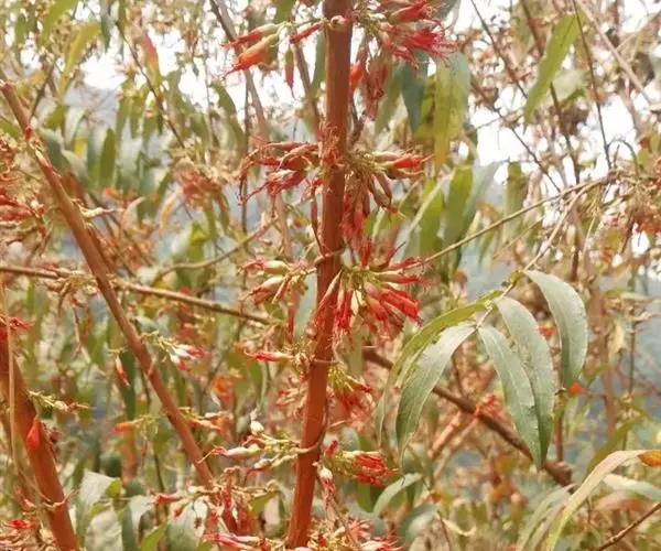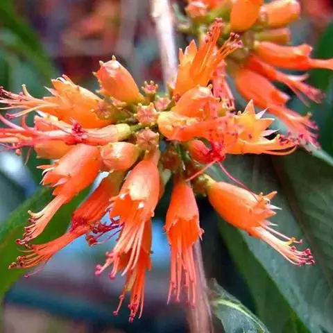 1-15花组成短聚伞状圆锥花序,长约3cm,被短柔毛;花梗长3-5mm;萼筒花瓶状,鲜红色,长9-15mm,裂片矩圆状卵形,长约2mm;花瓣小而薄,淡黄色,线状披针形,与花萼裂片等长,稀过;雄蕊12,突出萼外;子房矩圆形,2室,花柱细长,超过雄蕊。