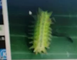 中国绿刺蛾幼虫 成虫长约12毫米,翅展21~28毫米;头胸背面绿色,腹背灰褐色,末端灰黄色;触角雄羽状、雌丝状;前翅绿色,基斑和外缘带暗灰褐色;后翅灰褐色,臀角稍灰黄。卵扁平椭圆形,长1.5毫米,光滑,初淡黄,后变淡黄绿色。幼虫体长16~20毫米;头小,棕褐色,缩在前胸下面;体黄绿色,前胸盾具1对黑点,背线红色,两侧具蓝绿色点线及黄色宽边,侧线灰黄色较宽,具绿色细边;各节生灰黄色肉质刺瘤l对,以中后胸和8~9腹节的较大,端部黑色,第9、10节上具较大黑瘤2对;气门上线绿色,气门线黄色;各节体侧也有1对黄色刺瘤,端部黄褐色,上生黄黑刺毛;腹面色较浅。蛹长13~15毫米,短粗;初产淡黄,后变黄褐色。茧扁椭圆形,暗褐色。