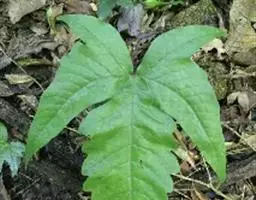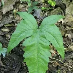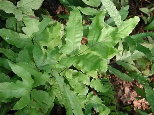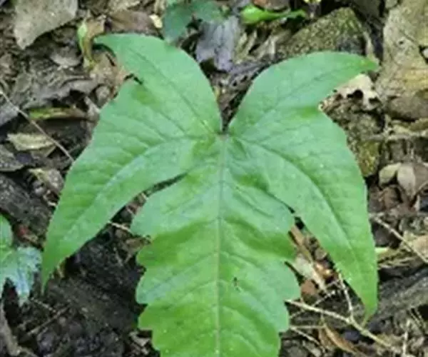 植株高50-70厘米。根状茎长而横走,粗约5毫米,顶部及叶柄基部均密被鳞片;鳞片线状披针形,长3-4毫米,先端长渐尖,全缘,膜质,褐棕色。叶近生;叶柄长20-40厘米,基部粗约3毫米,深禾秆色,上面有浅沟,全部疏被有关节的淡棕色短毛;叶二型: 不育叶三角状五角形,长25-35厘米,基部宽20-25厘米,先端长渐尖,基部近心形,一回羽状,能育叶与不育叶形状相似但各部均缩狭;顶生羽片三角形,长15-20厘米,基部宽约15厘米,基部楔形而下延,两侧羽裂,基部一对裂片最长;侧生羽片1-2对,对生,稍斜向上,间隔1.5-2.5厘米,基部一对柄长约1厘米,向上部的近无柄;基部一对羽片最大,三角披针形至三角形,长约15厘米,基部宽约10厘米,先端长渐尖,基部截形至浅心形,其两侧有1对近平展的披针形小裂片,边缘有波状圆裂片;第二对羽片椭圆披针形,长10-12厘米,基部宽3-4厘米,先端长渐尖,基部斜截形而稍与叶轴合生,全缘或有浅波状的圆裂片。叶脉联结成近六角形网眼,有分叉的内藏小脉,两面均明显而稍隆起,下面被有关节的淡棕色短毛;侧脉稍曲折,下面隆起并疏被有关节的淡棕色短毛。叶纸质,干后褐绿色,上面光滑,下面疏被有关节的淡棕色短毛,叶缘疏被同样的睫毛;叶轴及羽轴禾秆色,上面均被有关节的短毛,羽轴下面密被开展的有关节的淡棕色长毛。孢子囊群圆形,生于小脉联结处,在侧脉间有不整齐的2至多行;囊群盖圆肾形,坚膜质,棕色,脱落。染色体2n=160。 [1-2]
