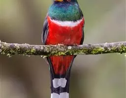橙胸咬鹃:全长约28厘米。雄鸟头、颈橄榄绿色,上体及中央尾羽栗色;中央尾羽具黑色端,…