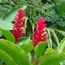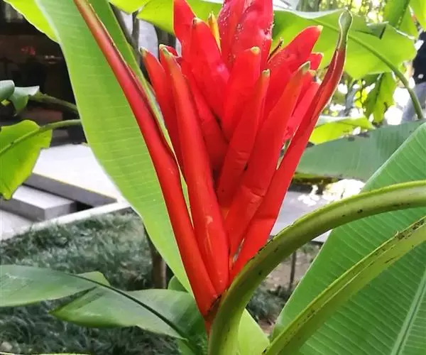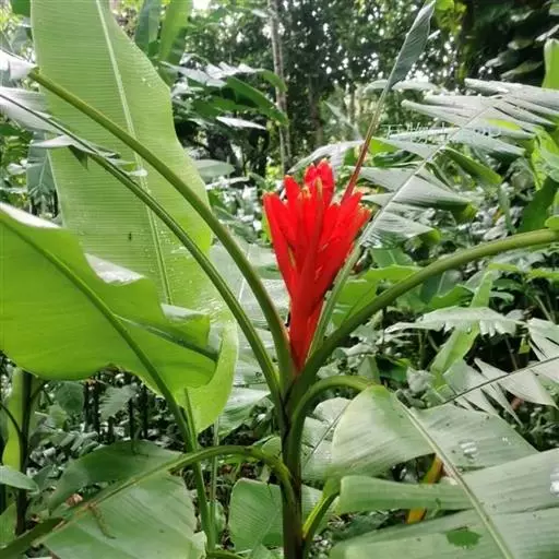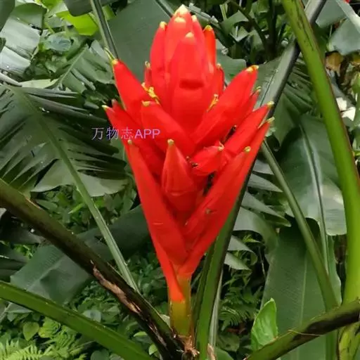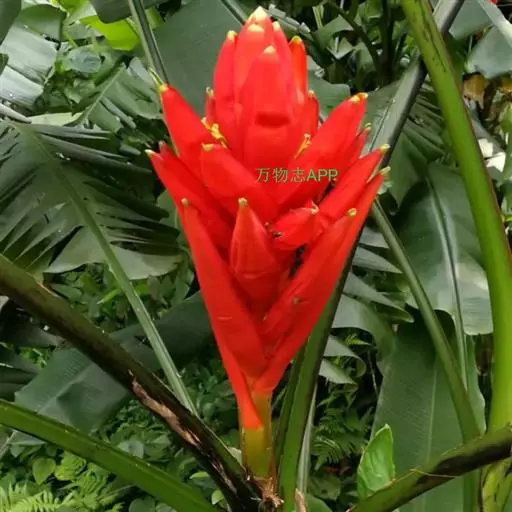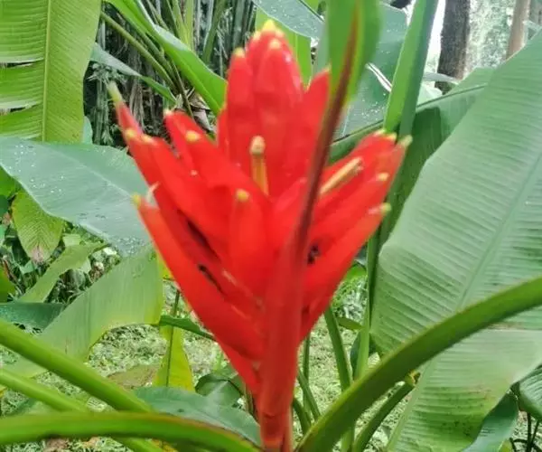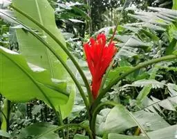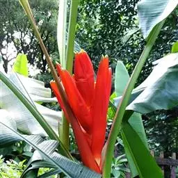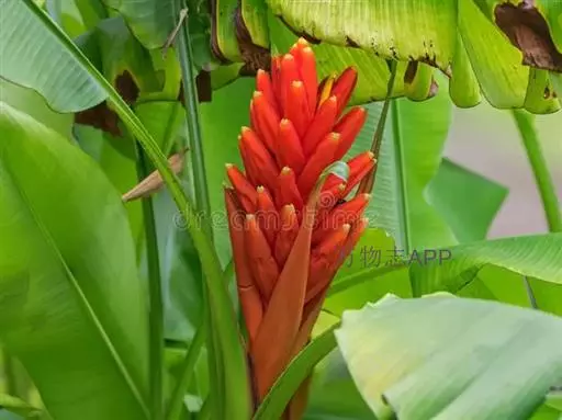 红蕉(学名:Musa coccinea Andr.),假茎高1-2米。叶片长圆形,长1.8-2.2米,宽68-80厘米,叶面黄绿色,叶背淡黄绿色,无白粉,基部显著不相等,浑圆而无耳;叶柄长30-50厘米,有张开的窄翼。花序直立,序轴无毛,苞片外面鲜红而美丽,内面粉红色,皱折明显,每一苞片内有花一列,约6朵;雄花花被片乳黄色,合生花被片具5 (3+2) 齿裂,二侧裂片具角,离生花被片先端尖且具细齿,与合生花被片几等长。浆果果身直,在序轴上斜向下垂,灰白色,无棱,长10-12厘米,直径约4厘米,果柄长3-3.5厘米,果内种子极多。
