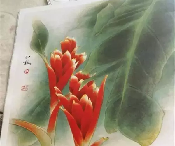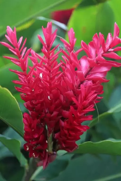 花序直立,序轴无毛,苞片外面鲜红而美丽,内面粉红色,皱折明显,每一苞片内有花一列,约6朵;雄花花被片乳黄色,合生花被片具5 (3+2) 齿裂,二侧裂片具角,离生花被片先端尖且具细齿,与合生花被片几等长。