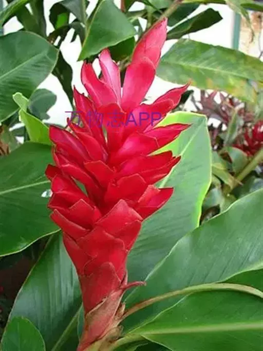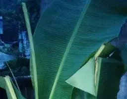 红蕉 假茎高1-2米。叶片长圆形,长1.8-2.2米,宽68-80厘米,叶面黄绿色,叶背淡黄绿色,无白粉,基部显著不相等,浑圆而无耳;叶柄长30-50厘米,有张开的窄翼。