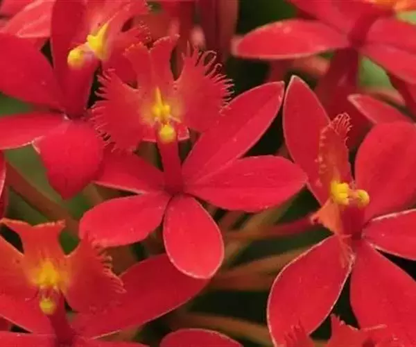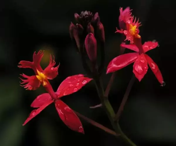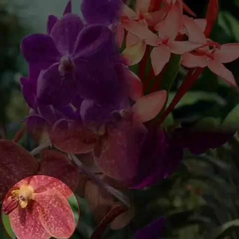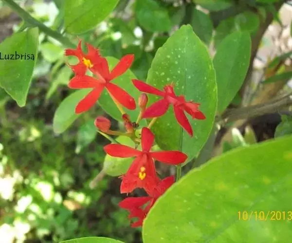 花朵:总状花序顶生,长70cm,着花10余朵,花瓣和萼片橙红色,唇瓣浅橙红色。