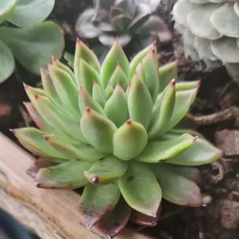 小红衣是景天科、拟石莲花属的一种多肉植物。叶片匙形,扁平细长,叶表具白粉,有明显的半透明边缘,…
